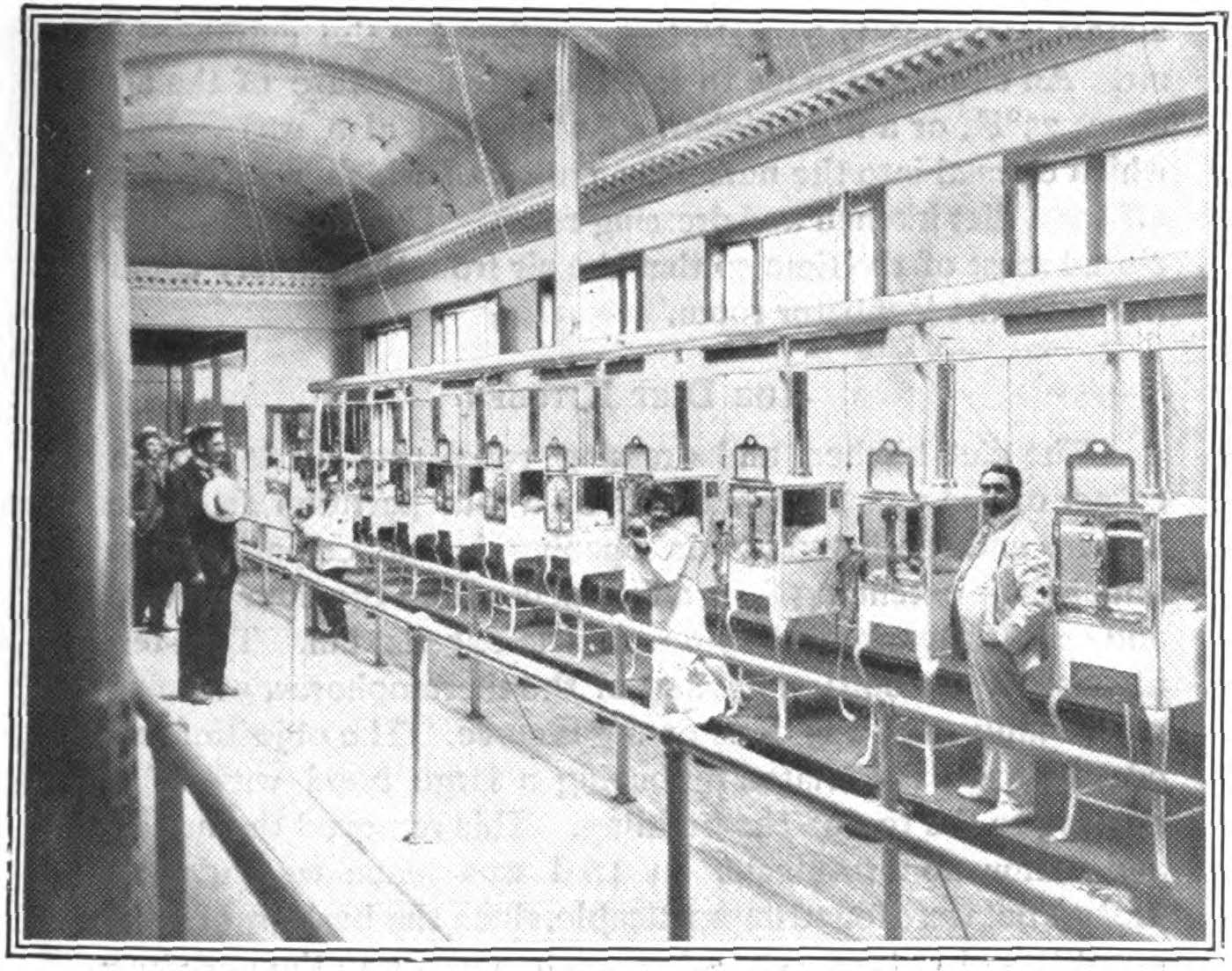 The incubators and nursery were in a brick fireproof building, while the dormitories for nurses and other attendants were in a separate part of the building which was constructed, as most other exposition buildings, of a wooden frame work and staff. (Fig. 1).