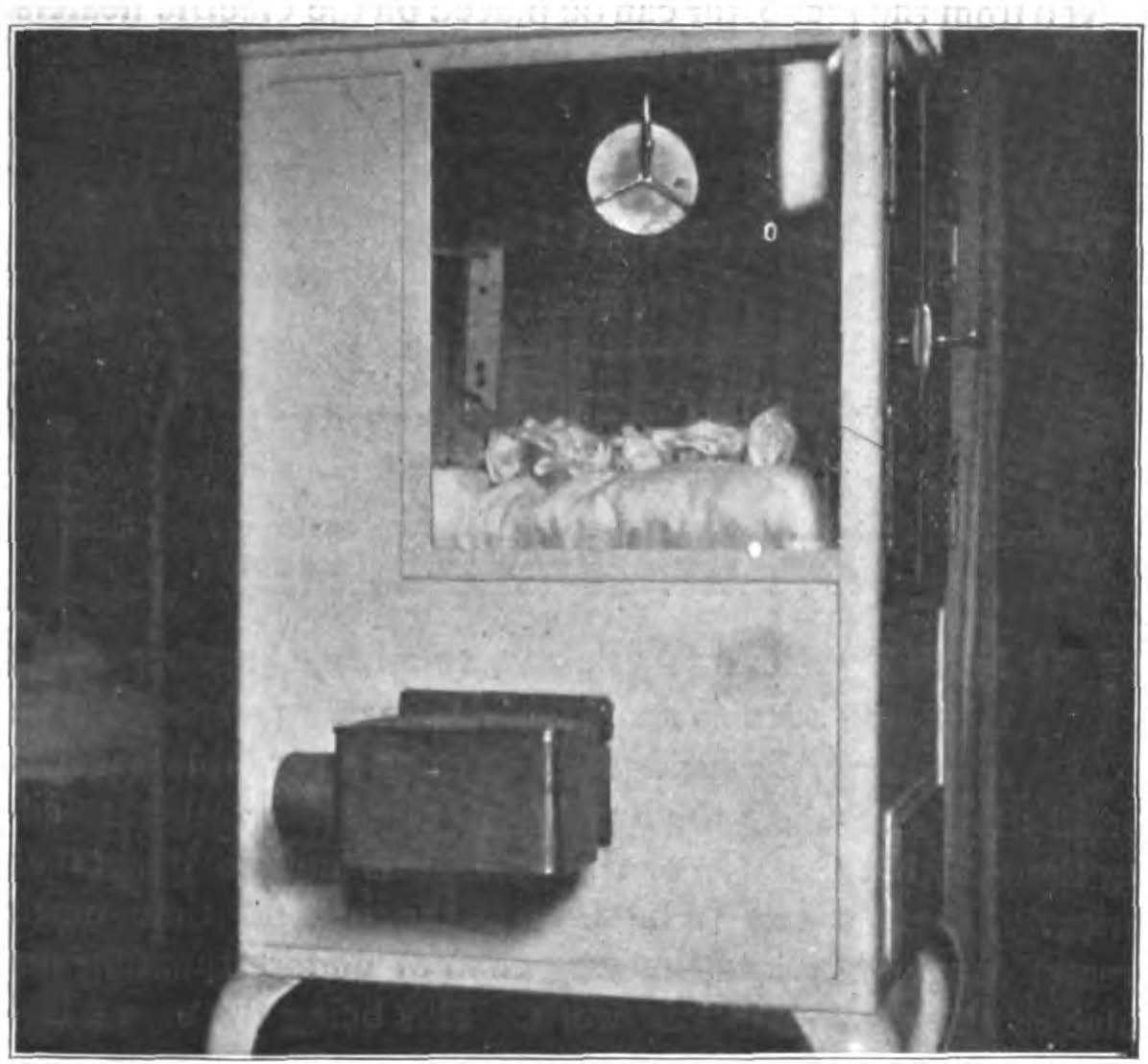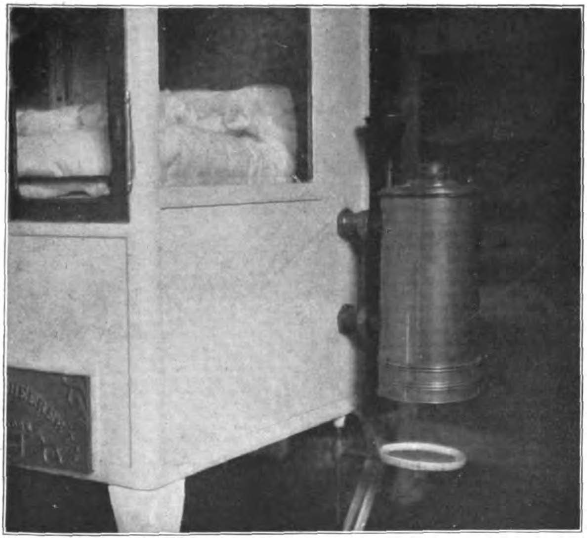 The ventilation was accomplished by a pipe conducted through the wall or window which delivered the air to a box fastened to the side of the incubators, where it was moistened and washed by passing through a layer of cotton over a saucer containing water or an antiseptic solution. We are really surprised to hear that the air passed over an antiseptic solution. This must also be some information obtained from the dealers. Medical science is not aware of any antiseptic which destroys bacteria in the air and at the same time is harmless to breathe, especially for young infants.