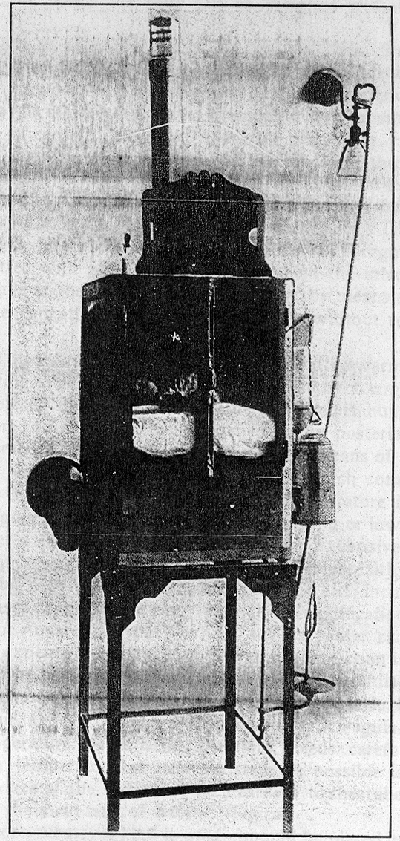 Ventilation is obtained by means of a tube of about three inches in diameter, entering the compartment low down on the left side. The exit is through a chimney in which is a fan, indicating by its rotation the strength of the current of air. The air on entrance is filtered by a gauze and cotton diaphragm. The front is fitted with glass doors through which the infant can be seen, while at the side is a glass window by means of which the nurse can attend to the infant’s wants without removal.