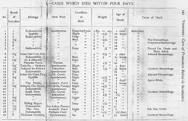 I. Twenty-nine of the incubator babies died within four days. All of these but 3 were more or less asphyxiated at birth; 9 were breech cases, and of these 5 were difficult extractions; 3 after an accouchement forcé in placenta previa. The rest were vertex presentations, but of these 2 were forceps deliveries; 6 were under seven months of uterine gestation; 22 were between seven and eight months along, and 1 eight and a quarter months.