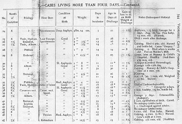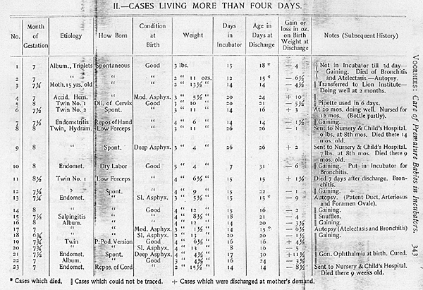 From this table our statistics are not as good as Tarnier’s unless we omit those babies who were in very poor condition at birth and who died in a few hours.