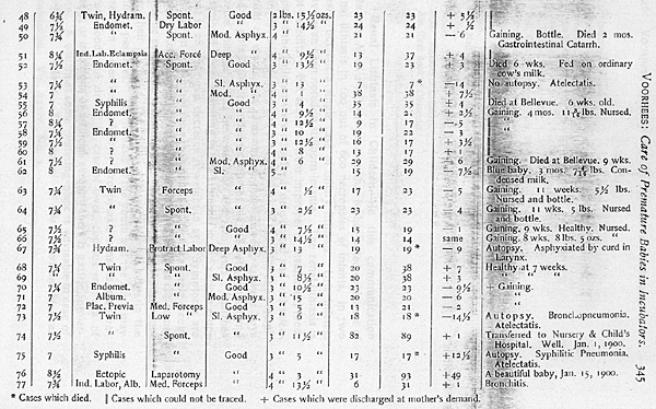In 16 diluted breast milk was supplemented at times, with a mixture of cow’s milk and water with Russian gelatine and lactose. In 10 a 1, 6, .33 modification was used. In all the rest diluted breast milk was relied upon. Twenty-seven never nursed at the breast of these 12 died. A few nursed as early as the third or fourth day, two or three times a day. Others not for three weeks, and one not till the sixty-eighth day. Of the 77, 13 died in the hospital, a mortality of 16 per cent. The cause of death was atelectasis and bronchitis in 7, acute asphyxia from a curd in the larynx in 1, syphilitic pneumonia in 1, cerebral hemorrhage in 1, gastroenteritis in 3 and a patent foramen ovale and ductus arteriosus in 1. The condition of 3 was poor at the time of discharge, fair in 24 and very good in 37; 32 were above their birth weights and 57 were gaining in weight. To letters written about January 1, 1900, no answer was obtained from 28. Thirteen were reported as having died, 1 of these lived fourteen months, 1 nine months, 1 four and one-half months, 3 lived two months, 6 lived six weeks, 1 only a month. Five of these children died at the Nursery and Child’s Hospital and 2 died at Bellevue Hospital. They were bottle fed and the probable cause of death was gastroenteritis. Twenty-one were found to be alive and doing well. Some had nursed and the others were bottle-fed. The oldest baby was twenty-two months and almost all were good, healthy children. One baby at seven months weighed 16 lbs. It weighed 4 1/16 lbs. at birth and nursed its mother after leaving the hospital. The ectopic and the Caesarian babies were in beautiful condition.STATISTICS.