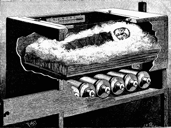 There are some that are so puny and frail among the many brought into the world by the anæmic and jaded women of the present generation that, in the first days of their existence, their blood, incapable of warming them, threatens at every instant to congeal in their veins. There are some which, born prematurely, are so incapable of taking nourishment of themselves, of breathing and of moving, that they would be fatally condemned to death were not haste made to take up their development where nature left it, in order to carry it on and finish it. In such a case it is not, as might be supposed, to the exceptionally devoted care of the mother that the safety of these delicate existences is confided. As the sitting hen often interferes with the hatching of her eggs by too much solicitude, so the most loving and attentive mother, in this case, would certainly prove more prejudicial than useful to her nursling. So, for this difficult task that she cannot perform, there is advantageously substituted for her what is known as an artificial mother. This apparatus, which is identical with the one employed for the incubation of chickens, consists of a large square box, supporting, upon a double bottom, a series of bowls of warm water. Above these vessels, which are renewed as soon as the temperature lowers, is arranged a basket filled with cotton, and in this is laid, as in a nest, the weak creature which could not exist in the open air.