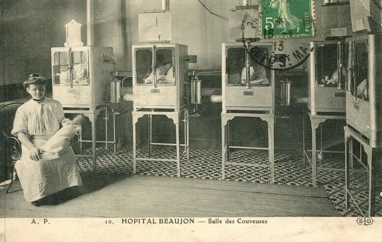 Above: Incubators of Alexandre Lion’s design at the Hǒpital Beaujon in Clichy France, postmarked 1913.