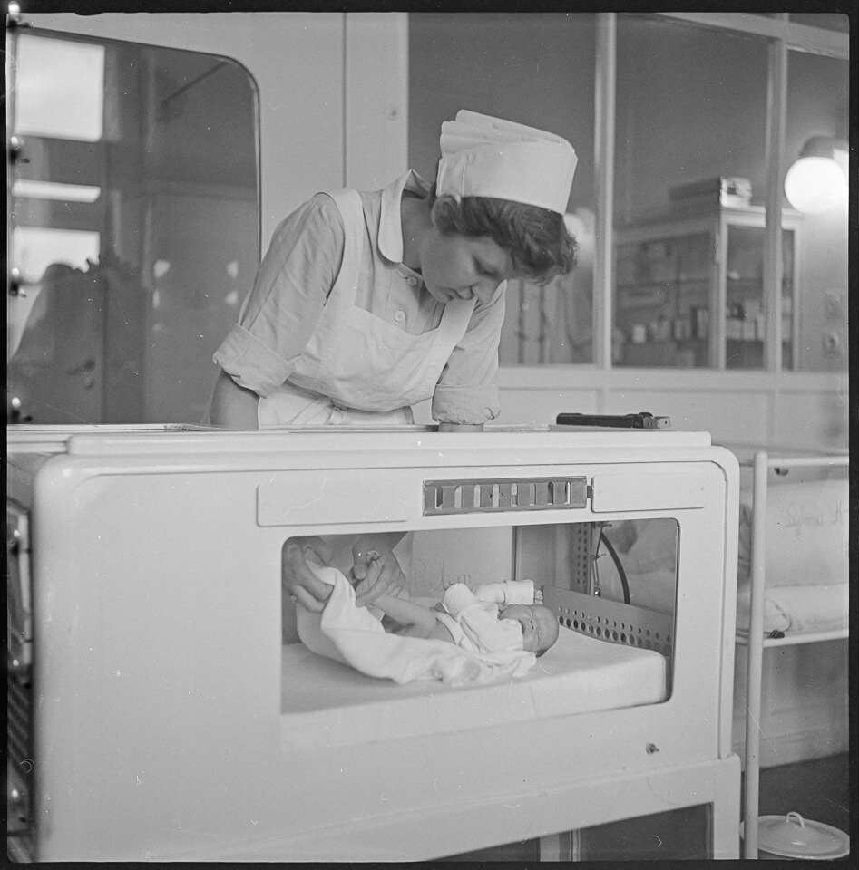 Above: A baby in an incubator in the neonatal ward of the Weißensee hospital is being changed by a nurse, 1961. Photo by Kurt Schwarz. Source: Deutsche Digitale Bibliothek.