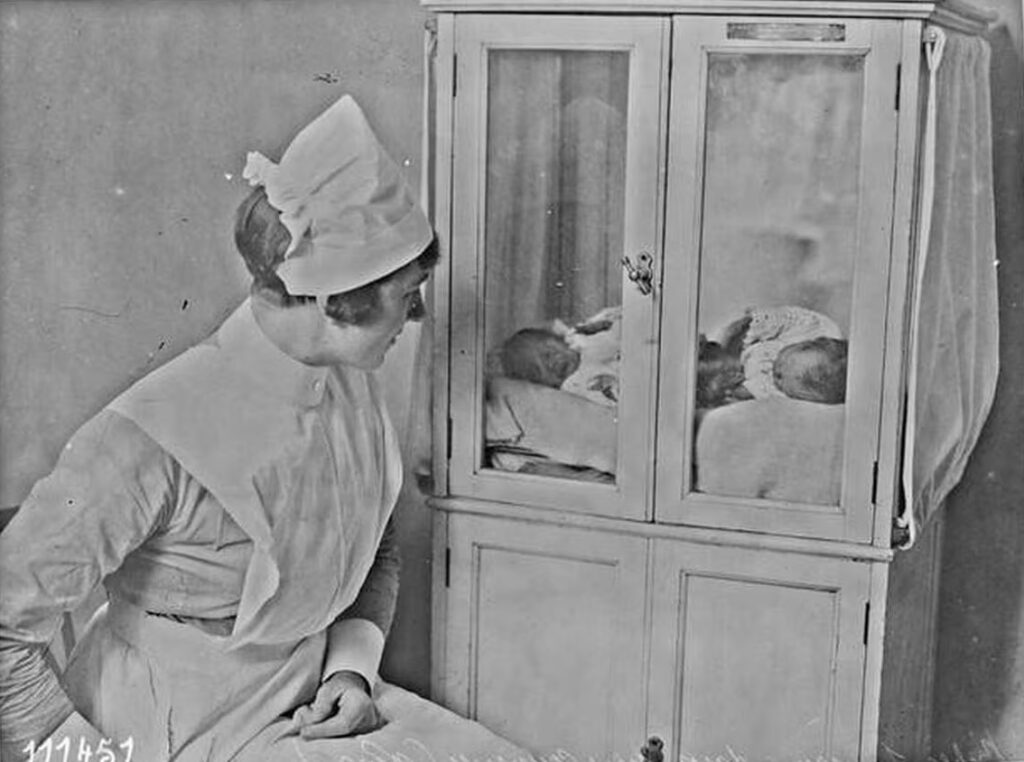 Above: Nurse changing the warm water bottles on an incubator of the Tarnier/Auvard/Budin design, at a newly opened “baby home” (säulingsheim) in Schöneberg near Berlin, 1904.