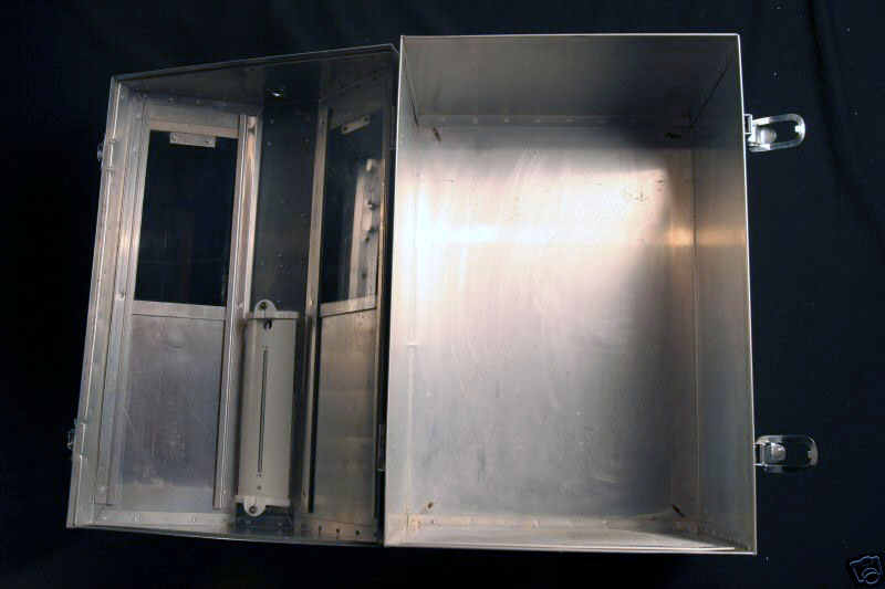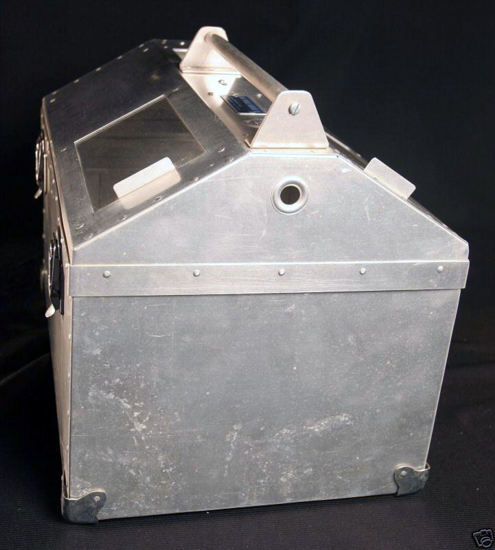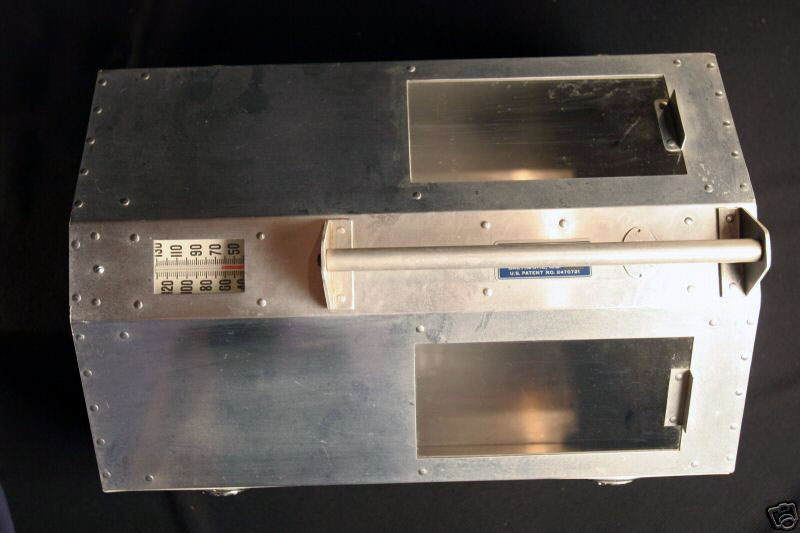 The incubator appears to be constructed of stainless steel. It measures 19 1/2″ long by 13″ wide by 15″ tall. There are two latches on the front which release a hinged top. The top has two sliding plexiglass viewing windows and one end has a sliding metal door with a screen beneath. There is a thermometer inside the lid which is visible through a small window. There is a hole in the end through which a tube is inserted. There are parts in the drawings and description of the patent which we do not have. They show an attachment on the end for supporting a small oxygen tank for feeding controlled amounts of oxygen into the incubator enclosure with adequate moisture in the gas which is most favorable to the breathing needs of the infant. They also show a platform insert upon which the baby is to rest.