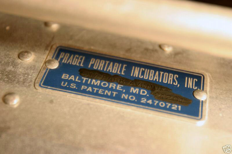 The patent for this incubator is 2,470,721, dated May 17, 1949. It was obtained by J. L. Pragel whose name appears on the label for this item. The metal plate reads: Pragel Portable Incubators, Inc., (address is crossed out), Baltimore, MD. U.S. Patent No. 2470721. There is a second identification tag riveted to the item which reads: Division of Public Health of Missouri 20298.