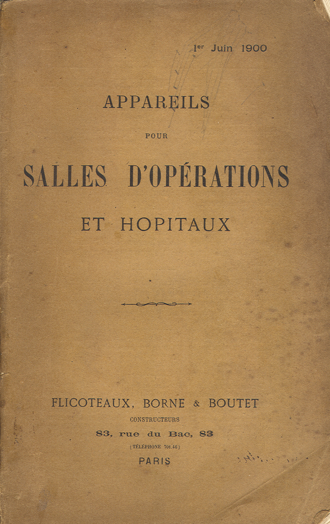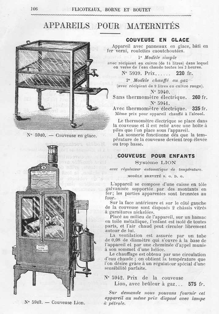 The June 1, 1900 operating room equipment catalog of Flicoteaux, Borne, and Boutet, Paris, contained two entries for incubators. The first is an all-glass model that may be a descendant of the original Tarnier incubators. The second is the Lion incubator which was widely used throughout France at that time and appeared at many international expositions.