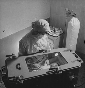 “Nurse Training. Care of prematurely born babies is one of the most complicated procedures which must be learned by the student nurse. Feeding, bathing, and diaper changing are carried out inside the incubator, in which temperature, humidity and oxygen must be carefully regulated. The oxygen tank can be seen in the background.” — United States, Office of War Information, Overseas Picture Division, Washington. Photo by Fritz Henle, November, 1942