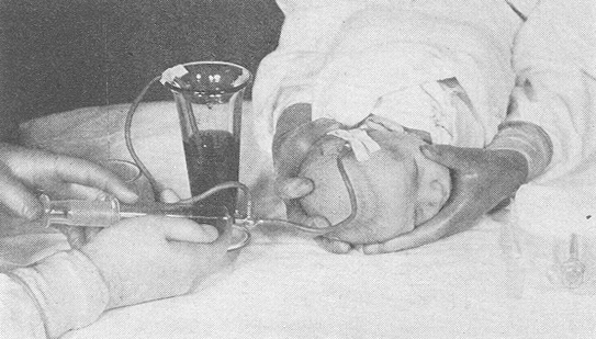 Above: “Administering oxygen. The forked, metal nasal tip (Bullowa) has served us well for oxygen administration. It is kept in place by a strip of adhesive. The other end of the rubber tube is attached to the oxygen tank.”