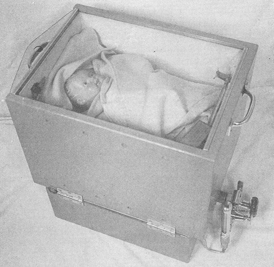 Above: “Portable incubator used to transport premature infant from its home to the hospital. It measures 18 1/2 inches long, 14 inches wide and 13 inches high. Note the oxygen tank in the lowest compartment; the cover which slides in over the infant; and the thermometer in the infant’s section.”