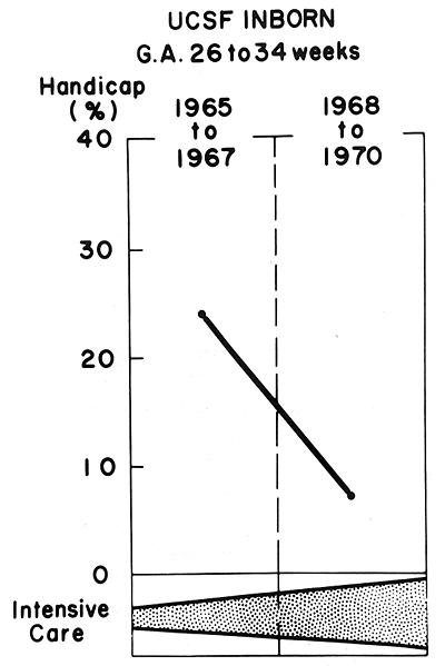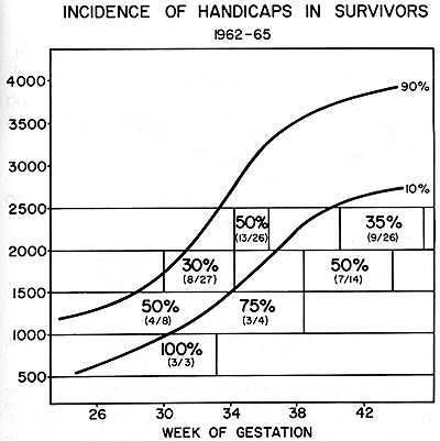 It was not until the late 1950’s that the incidence of handicaps in our graduates was suspected to be greater than the incidence reported by Hess. In Colorado, survivors with birth weights of 1500 grams or less who were born between July 1947 and July 1950 were reported on.[5] An incidence of 68% of central nervous system and visual handicaps was found in 63 of 94 survivors. In addition, growth retardation and social and emotional problems were encountered, and school failure occurred in 30% of children with normal intelligence.