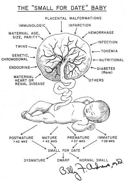 Over the past quarter century, I have also had much interest in the size, appearance of wasting, degree of maturation and wasting of infants of varying gestational ages as incorporated into the often used Figure 3. Comments and observations of Harvey were stimuli for my investigations upon the small for gestational age infants, the parabiotic syndrome, amniotic fluid studies, and other ventures into the physiology and metabolism of the newborn. Surely Davison and Bruton are my moderns and informants of the way and Harvey my ancient leader. Even in his study of chick embryos, Harvey reported, “Some are found more precocious and forward, having everything more precocious and formal, having everything more distinct; others, again, are more sluggish and these have the parts less apparent,” [4] for date. In his treatise on Parturition he states, “Some nine month’s children are very small, much less in fact than many foetuses of eight months, nevertheless they do not abide longer in the womb. And as to weight, any twins of eight months are far heavier than a single nine months’ child; yet they are not expelled before nine months are completed.“[6] In the treatise on Humours; “And so some women are seen with the abdomen immediately distended, and yet they bring forth a little shrivelled foetus accompanied by a vast flow of water.”[7] A statement of Harvey’s which applies to nutrition and blood flow is, “In like manner, that which is abundantly nourished increases; what is not sufficiently supplied shrinks; what is perfectly nourished preserves its health; what is not perfectly nourished falls into disease. The blood, therefore, even as the soul, is to be regarded as the cause and author of youth and old age, of sleep and waking, and also of respiratory; all the more and especially as the first instrument in natural things containing the internal moving cause within itself. “[4]