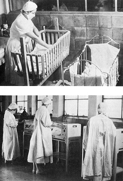 This was very much the way of life until the late 1800’s when, in order to meet better standards of care, the setting for birth was moved from the home to the hospital. Initially mothers and infants were cared for in the same maternity wards; however, the elevated mortality and morbidity from infectious disease led to strict isolation techniques and exclusion of visitors (see Figure 5). In 1940, isolation practices led to the formation of separate wards for mothers and babies which remained the predominant mode of care until recently.