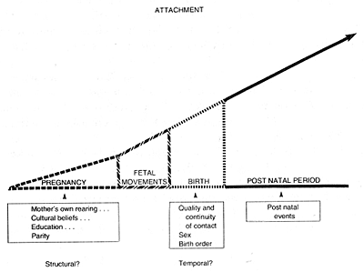 The human maternal infant bond starts early in pregnancy, has a tendency to strengthen as the child grows older and is affected by numerous factors (see Figure 6). At the present time, data to support the existence of a sensitive period in the human species are inconclusive. Although a majority of mothers feel a sense of belonging to their infants immediately after birth, in some mothers this sense of intimacy commences at a later time. McFarland[30] has pointed out that normal women become attached to their infants at different intervals of time: 41% during pregnancy, 24% at birth, 27% during the first week of life, and the remaining 8% after the first week of life.