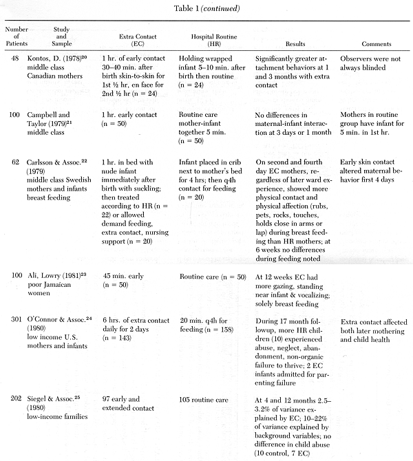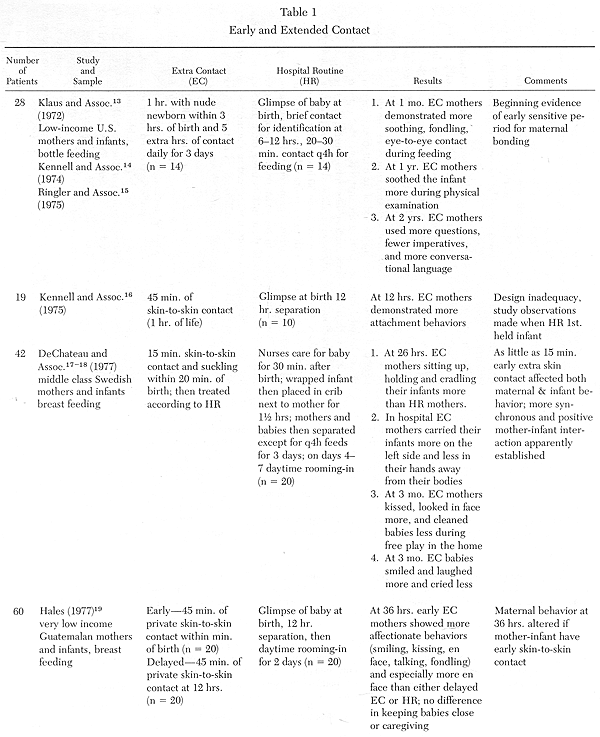 In the last 15 years there has been increased interest in the possible effects of attachment and separation between the mother and her newborn infant. Several studies have focused on the importance of early contact and improved motherhood (see Table 1). Although, to date, more than 13 separate studies have demonstrated a relationship between early contact and improved maternal attachment, important questions still need to be answered. Klaus and Kennell[13-14] have pioneered many of the initial studies on separation.
