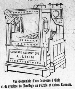 The engraving below is the earliest image I have found of the Lion incubators. It was the work of Victor Rose and appeared in the Le Monde article of November 10, 1894 about Lion’s exhibit at the Lyon Exposition of 1894. It was reused in several other articles about the Lion Incubator and also on postcards.