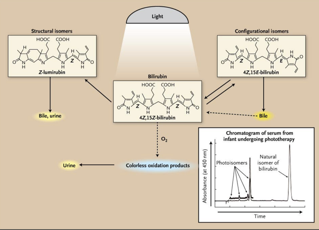 Although phototherapy had been demonstrated to be effective, it took longer for the mechanism of action to be understood. Initially, it was thought that bilirubin was being degraded by a process of photo-oxidation. While photo-oxidation of bilirubin does occur, it is now known to be a very slow process and not a significant contributor to the decline in bilirubin levels. In 1985, Antony McDonagh and colleagues identified a specific chemical process involved — structural isomerization — where light converts bilirubin into to two different isomers that (unlike naturally occurring bilirubin) do not require processing by liver enzymes before being efficiently excreted in the bile and urine.[3]