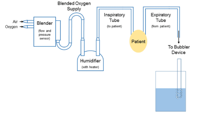 The invention of bubble CPAP significantly simplified the use of CPAP for respiratory distress syndrome. A continuous flow of air with a predetermined percentage of O2 is delivered to the infant through nasal prongs or a nasal cannula, but Instead of controlling the end-expiratory pressure with a ventilator and its associated tubing as well as its management by a respiratory therapist, the end-expiratory pressure is managed by the simple expedient of submerging the exhaust tube in a container of water. The depth of the tube in the water controls the pressure (cm of H2O) delivered. The bubbling action also creates gentle vibrations (oscillations) which may assist in gas exchange and lung recruitment.