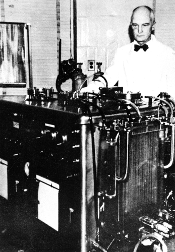 Dr. Gibbon and the first heart-lung machine used on a human during open-heart surgery.