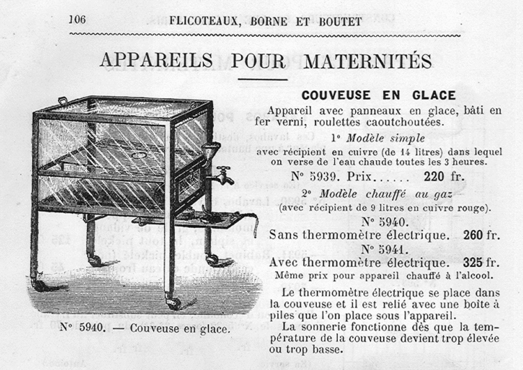 While Tarnier, Auvard, and Budin apparently made no effort to commercialize their design, they published widely, and adaptations of their incubator were widely used throughout Europe because of their simplicity and can be found in pictures from various hospitals throughout the early 1900s (see our “Incubators Through the Years” page). At least a few companies are known to have produced commercial versions that were based on the Tarnier-Auvard-Budin design, such as the the glass and metal incubator advertised in a Paris medical supplies catalog seen below, and the “Hearson Thermostatic Nurse” manufactured in London.
