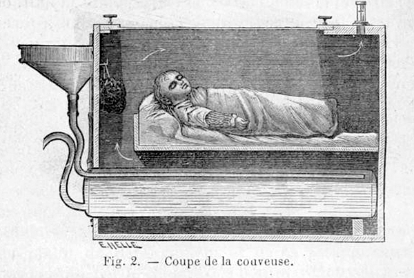 Tarnier collaborated with Odile Martin, the zoo’s poultry manager and engineer, to adapt the design. The first “Tarnier-Martin” incubator was introduced at the Paris Maternité in 1881. It was a large, wooden, two-tiered box capable of holding several infants, heated by a water tank and a gas-powered thermosiphon.