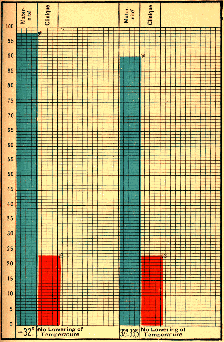Figure 1. In blue: Mortality of infants weighing 2000 grams or less brought with depression of temperature to the department for weaklings in the Maternité. In red: Mortality of infants weighing 2000 grams or less, born at the Clinique Tarnier, where every precaution is taken to avoid exposure to cold. | |