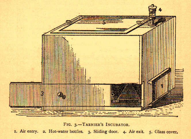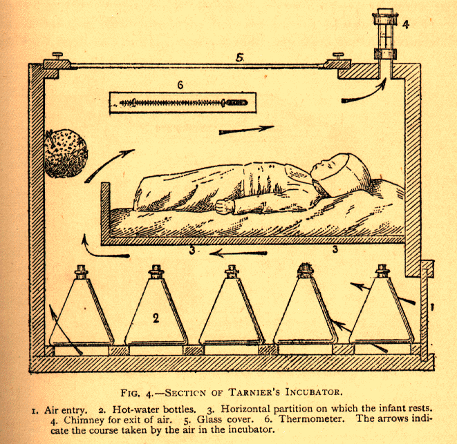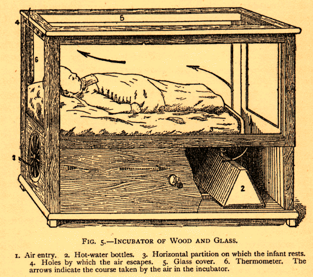 In 1885, Professor Pajot, in this Clinique, prepared a chamber as a giant incubator in which to place infants, congenitally feeble, so that they might not be exposed to cold when they were being fed or changed. The wet-nurses, however, were obliged to feed and tend them in this oven; and the mothers, separated from their infants, soon lost all interest in those whom they were unable to nurse or cherish.