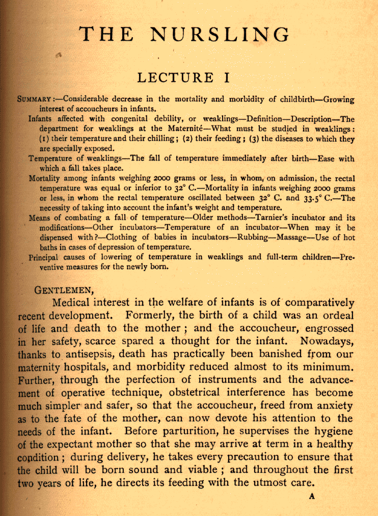 We have proof of this in the results obtained at the Clinique Tarnier. From the moment of my entry, I insisted on the necessity of preventing the chilling of the newly born, and those congenitally feeble I immediately placed in incubators.
