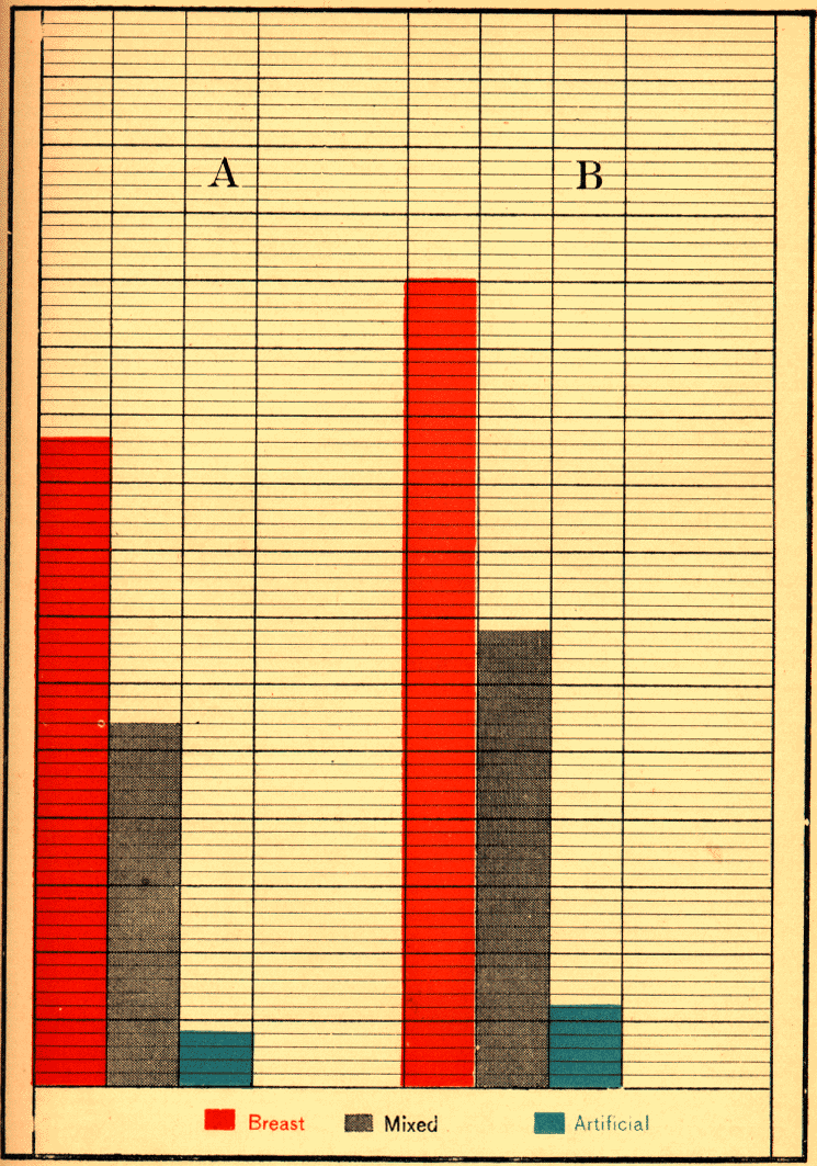 Fig. 119. Consultation for Nurslings at Clinique Tarnier. A, Number of infants of the Consultation in 1899 who were reared on breast, mixed, and artificial feeding respectively. B, Percentage proportion of infants on these modes of feeding. | |