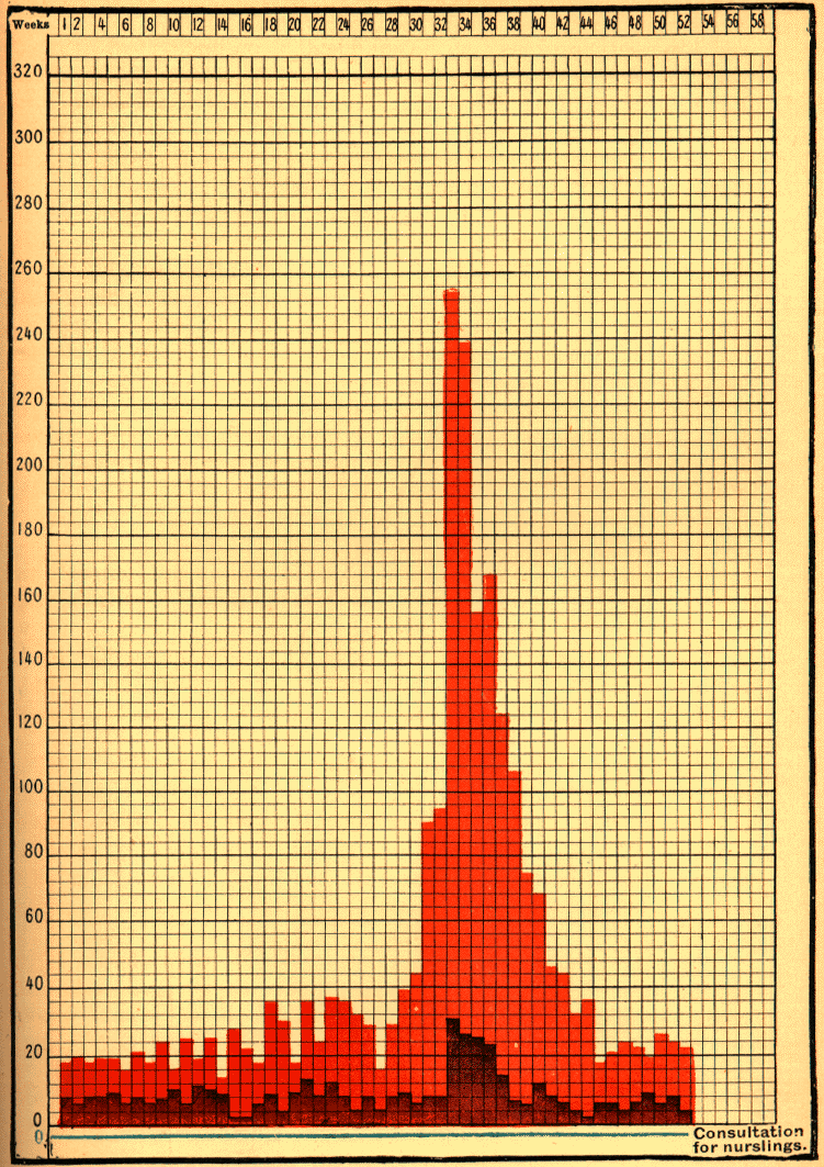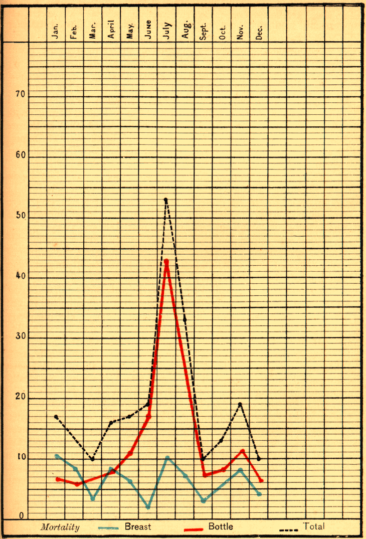 The mortality from August 7 to September 3 was frightful; in four weeks 833 infants perished from diarrhoea. From August 14 to August 27, 550 of these deaths occurred, of which 493 were among bottle-fed infants. On the curve this sudden increase in the death-rate recalls the appearance of the Eiffel Tower.