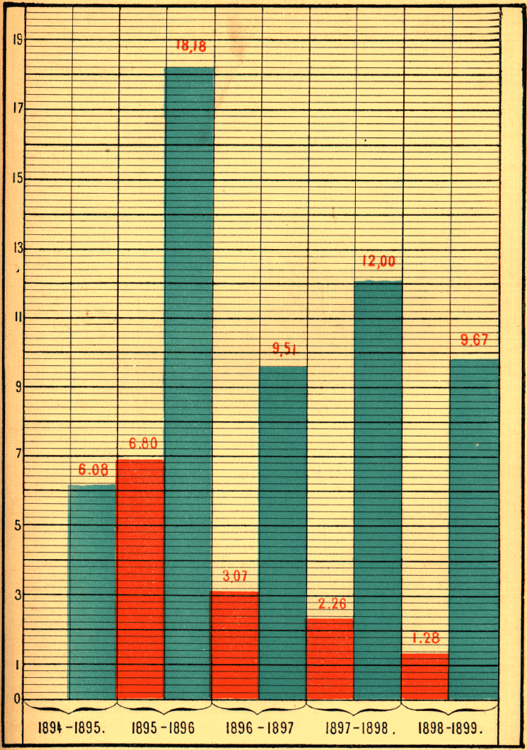 Fig. 122. Mortality from enteritis in the town of Fècamp and at the "Goutte de Lait" (Dufour). The blue columns indicate the mortality in Fècamp, the red the mortality at the "Goutte de Lait." | |