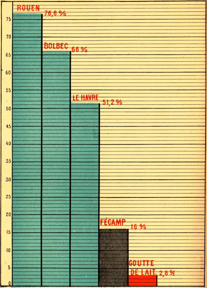 Fig. 123. Mortality from enteritis among infants under one year of age in the principal towns of Normandy and at the "Goutte de Lait" during August 1898 (Dufour). |