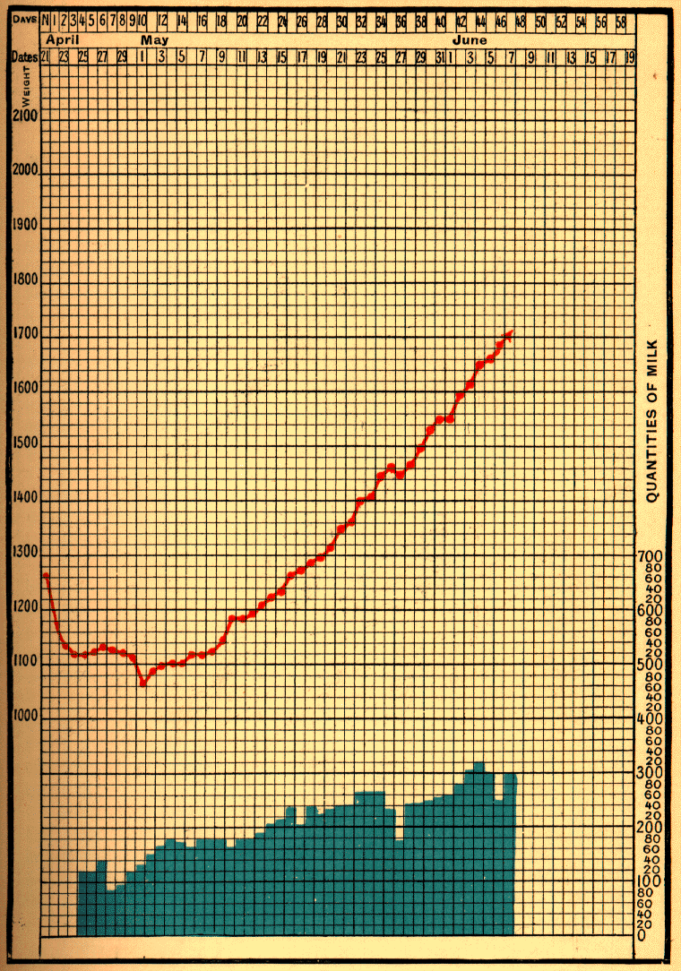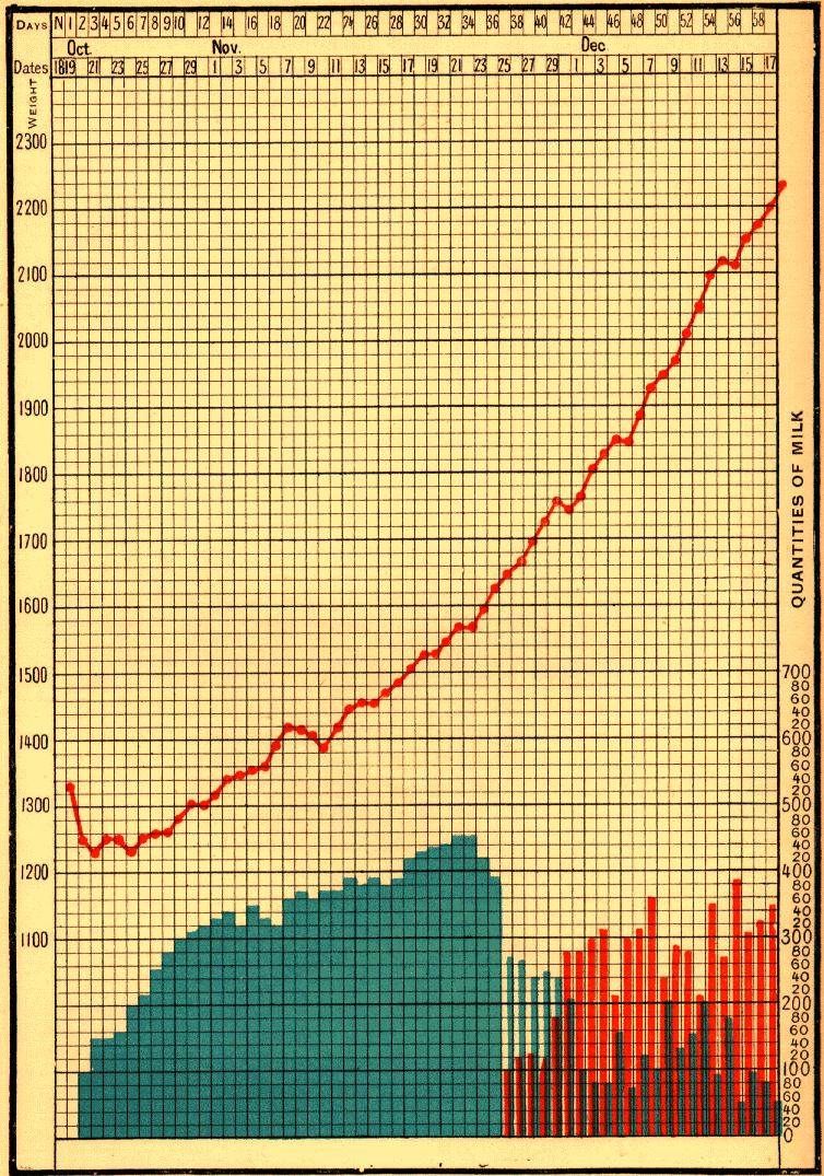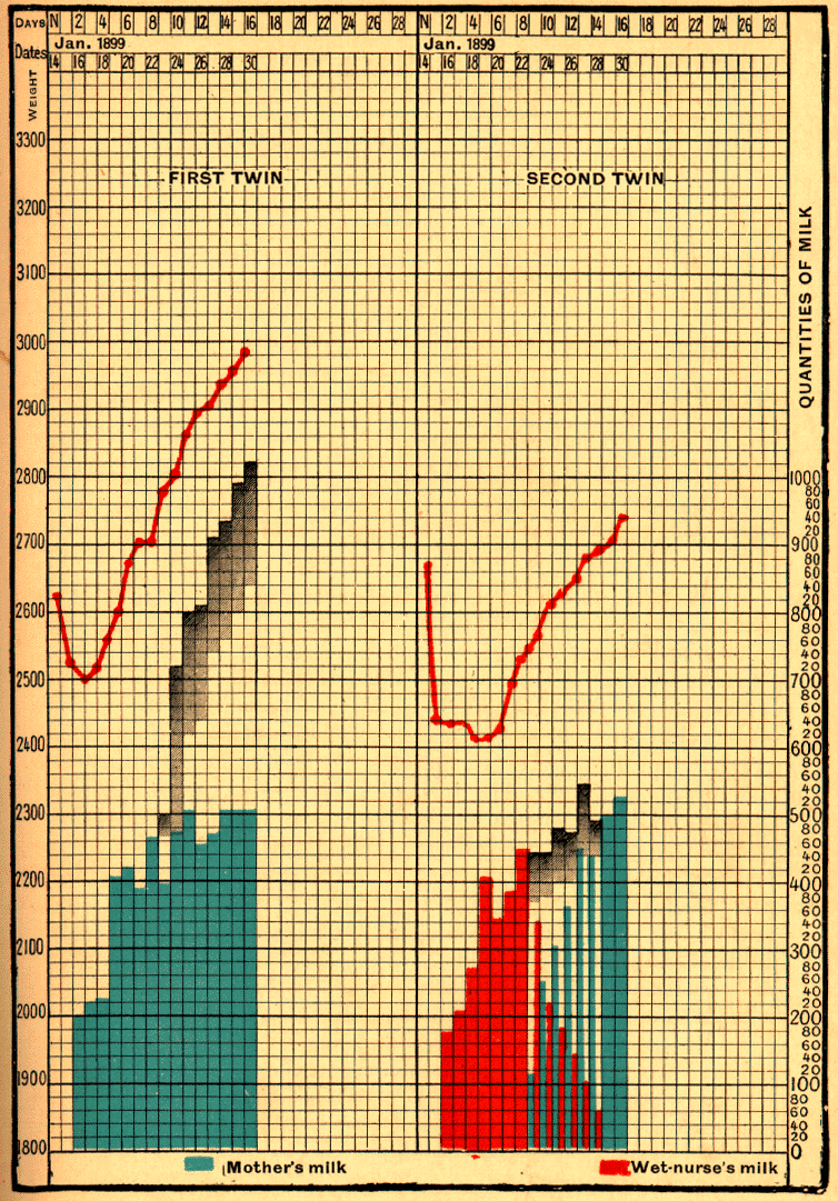 The infant Mong____, at his birth on November 7, 1898, weighed 1625 grams; his weight fell to 1450 grams. He was first fed by a wet-nurse, and the mother, who had suckled in the meantime a stronger infant, began to nurse him herself on December 14. The quantity of milk she furnished to him went on increasing, whilst that which the wet-nurse provided was diminished proportionally. On January 15 the wet-nurse was dispensed with altogether, and on January 16, the day of their discharge from the hospital, the baby weighed 2800 grams, and the mother continued to suckle it.