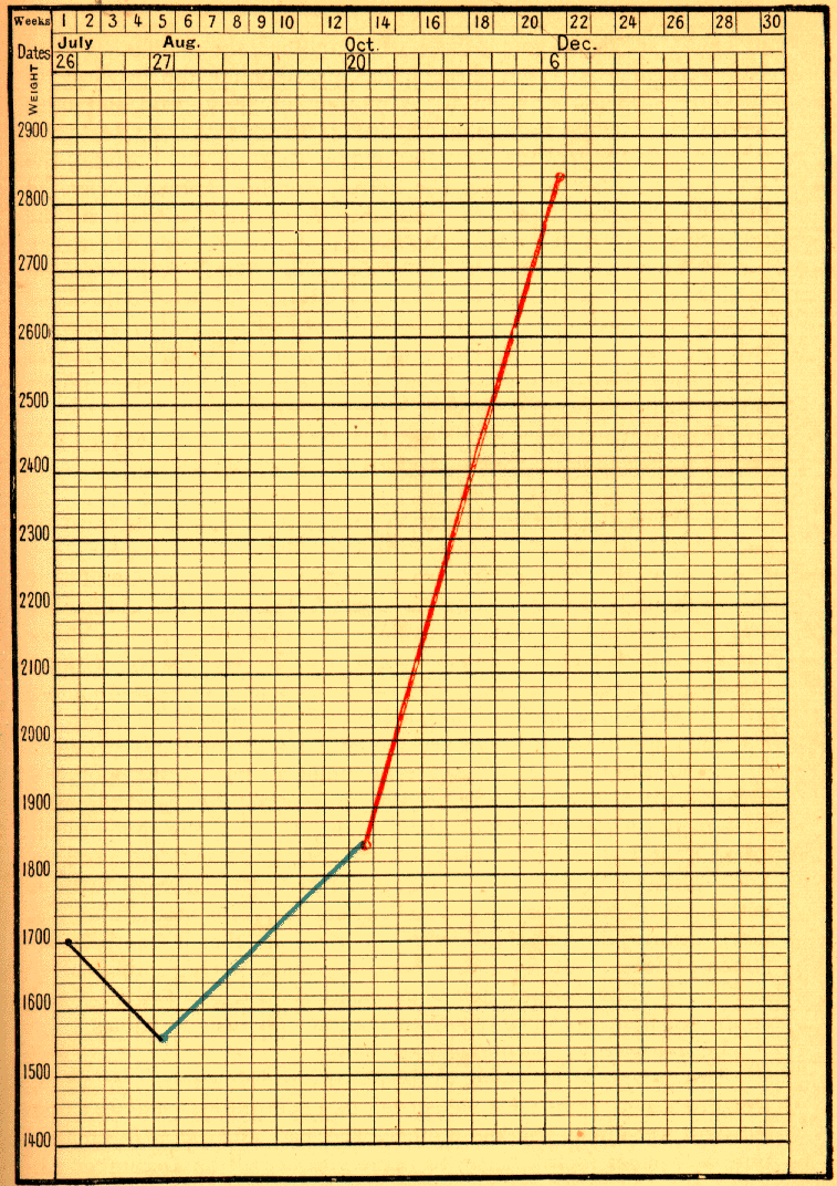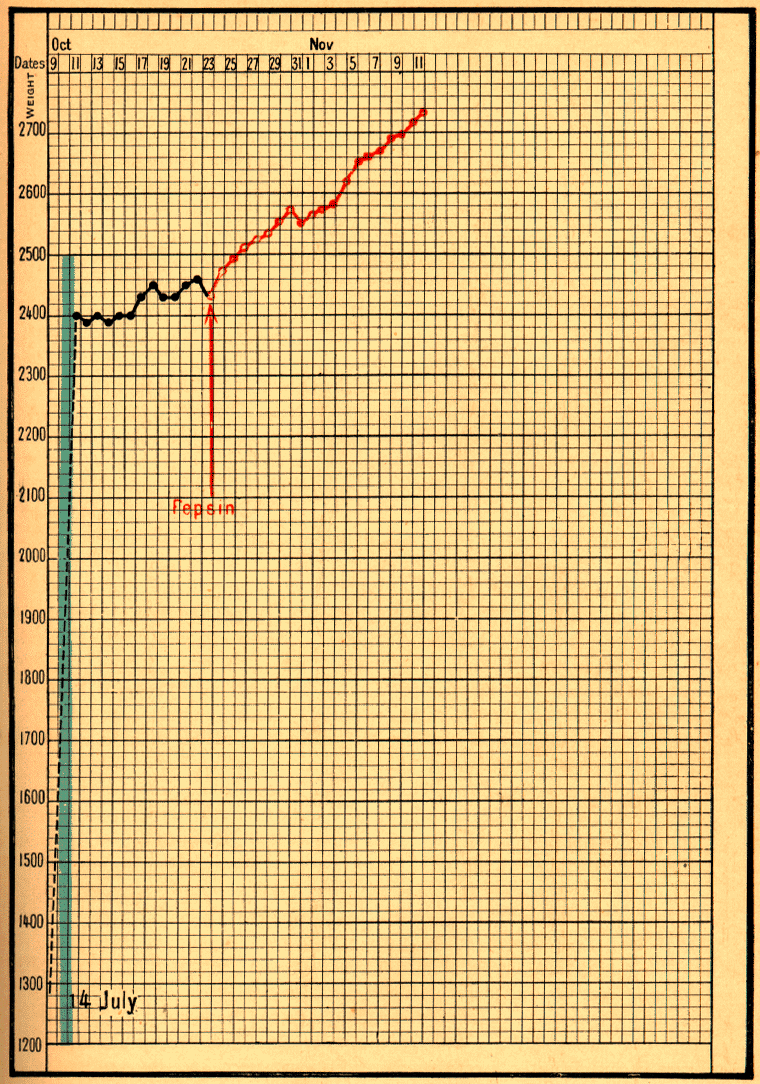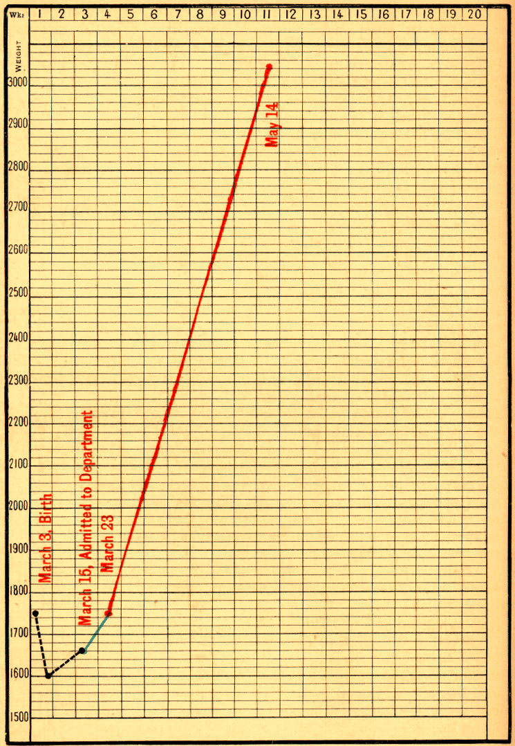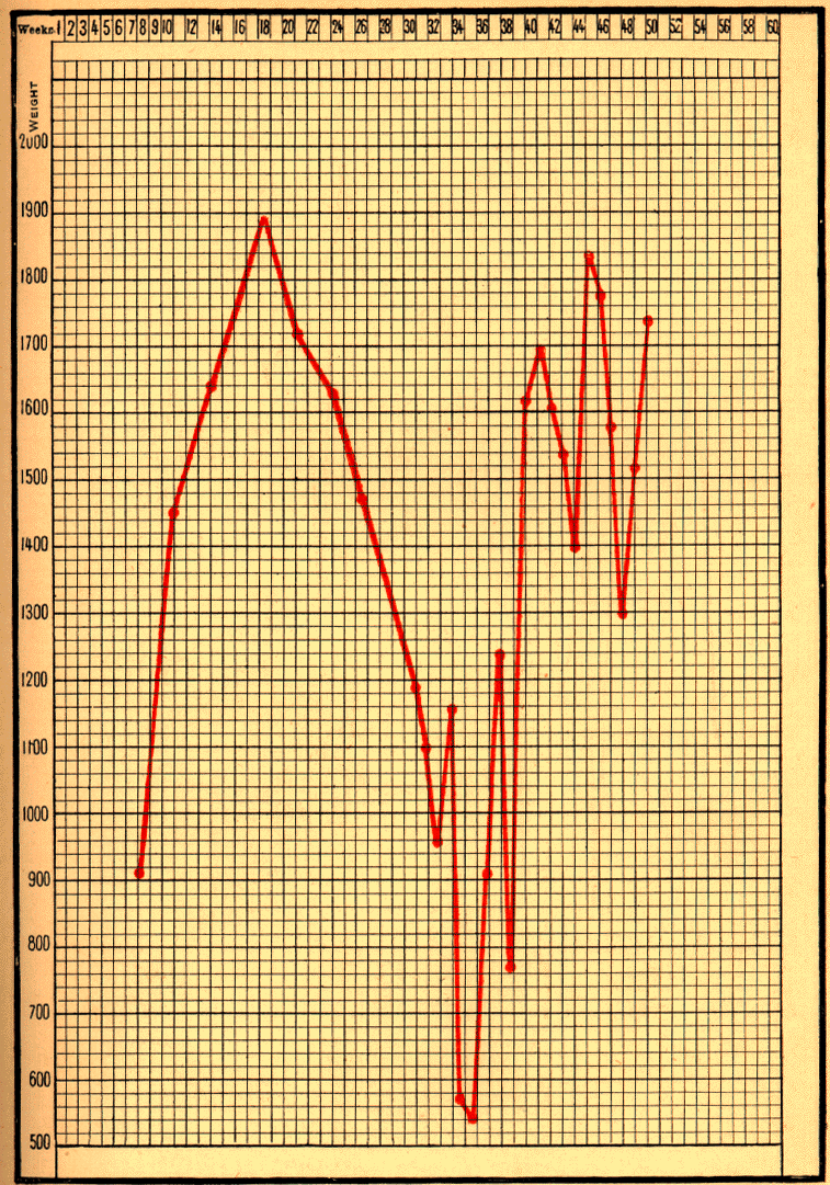 [1] This infant continued to do well; on February 17 he weighed 4300 grams; on March 10, 4880 grams; on March 17, peptones were suppressed, and pure milk was given alone; on September 22, 1899, at the age of ten months, he weighed 8140 grams.