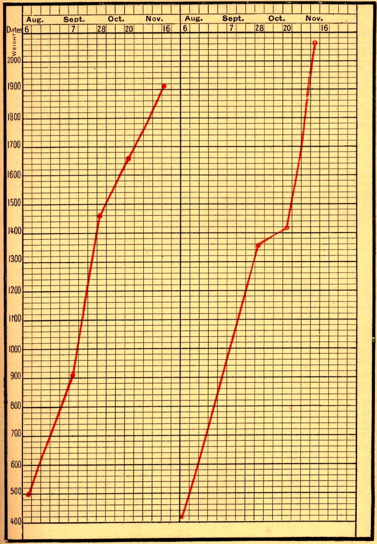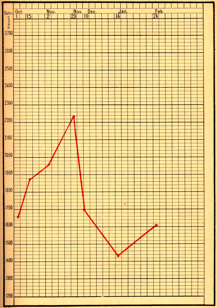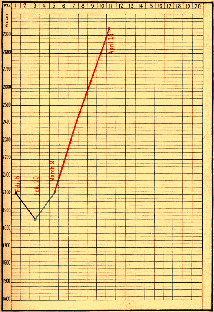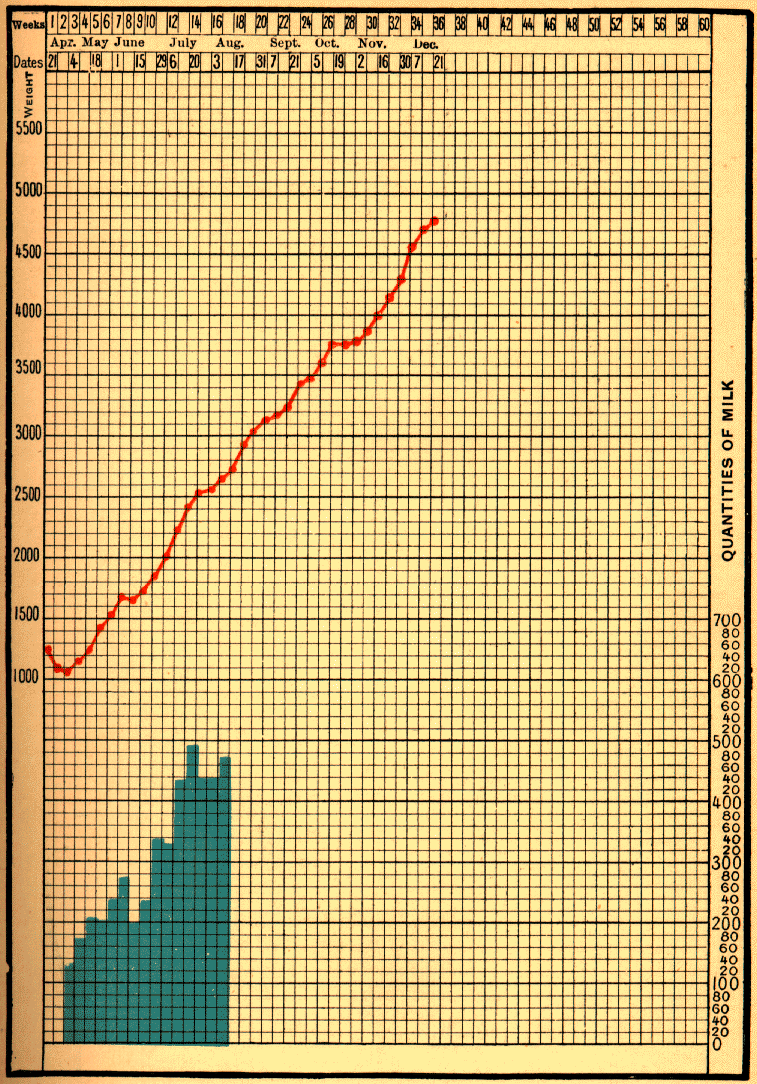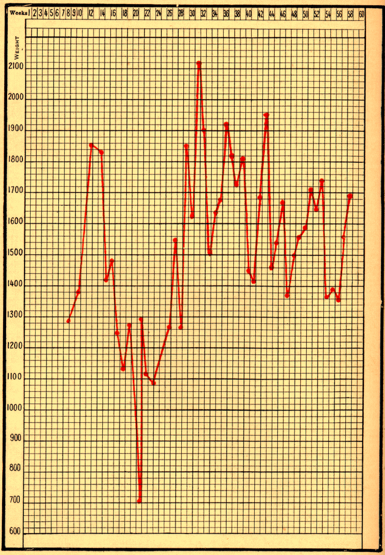 [1] This infant continued to do well; on February 17 he weighed 4300 grams; on March 10, 4880 grams; on March 17, peptones were suppressed, and pure milk was given alone; on September 22, 1899, at the age of ten months, he weighed 8140 grams.