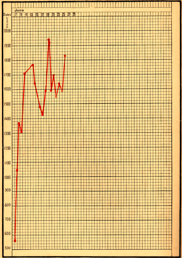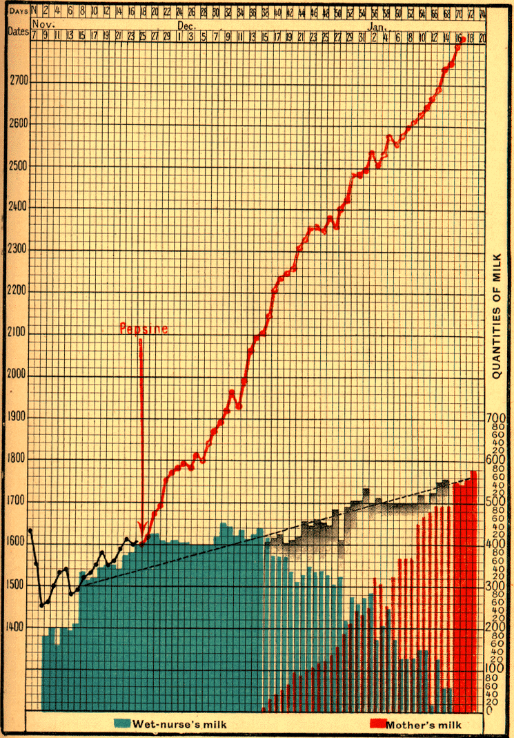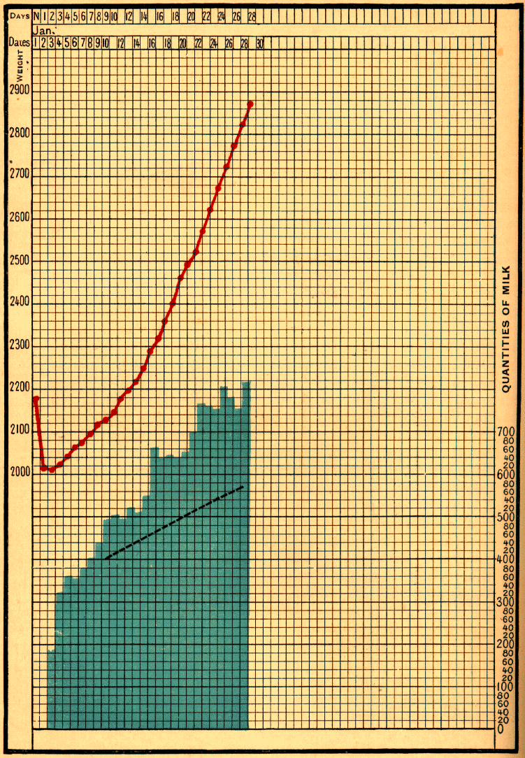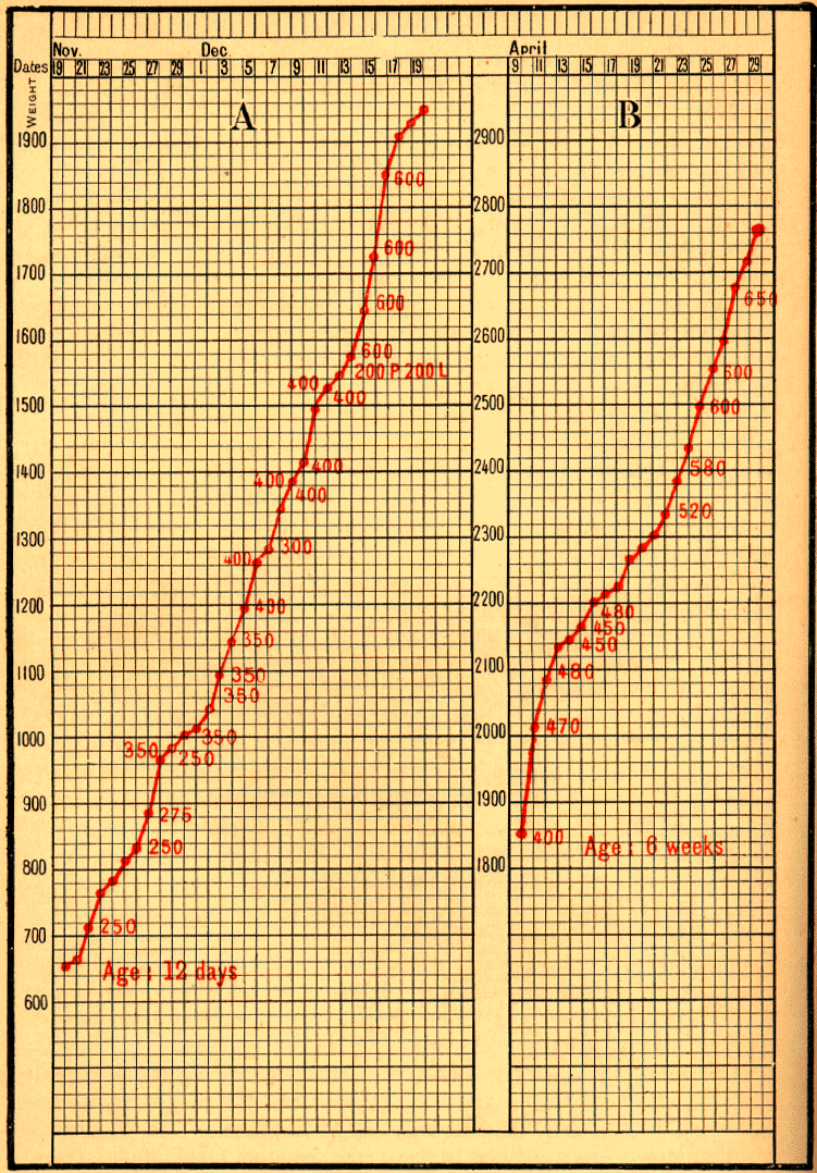 Born on November 24, 1898, at the Clinique Tarnier, Baby Lendr____ weighed 3800 grams, and when he left hospital on December 5 he weighed 3650 grams. The mother had not enough milk, so five bottles of sterilised milk, each containing 50 grams, were given daily. On December 9 he was still diminishing; his weight was only 3500 grams, so he received seven bottles of 50 grams. On December 16 he was 3700 grams, having increased 22.8 grams per day. In the next 14 days he added 290 grams, or about 21 grams per day; for on December 30 he weighed 3990 grams. On January 9 he reached 4020 grams, and on January 13, when he was brought to me with vomiting and diarrhoea, his weight was only 3800 grams. On January 16 he had lost 290 grams, and the digestive troubles had become worse. Having been admitted with his mother to hospital, he continued to lose weight, and fell to 3610 grams. Dieting and small doses of calomel and naphthol were followed by human milk and peptones, with the result that he very quickly recovered. He left hospital on February 8, weighing 4050 grams, and as the mother had not a drop of milk, the infant was given 350 grams of pure sterilised milk and peptones per day. [1]