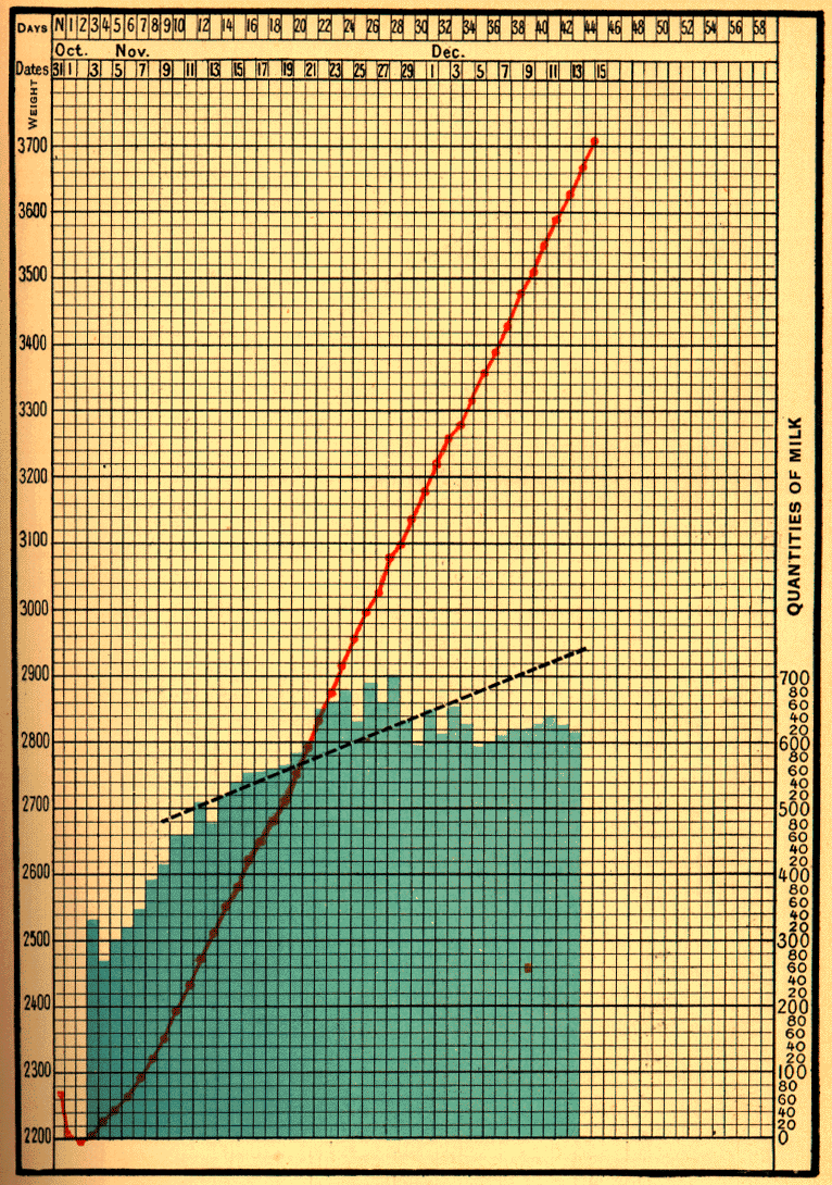 Every fortnight the amount of milk given by our wet-nurses was estimated. This was easily done. As you know, each weakling is weighed before and after meals, and at the end of the day the quantity it has ingested is thus readily estimated. If we added together the quantities of milk which the wet-nurse had furnished to those she suckled, those who had to be gavaged and fed by hand, and her own infant, we could obtain her total milk production in the twenty-four hours.