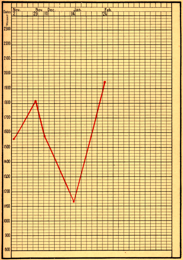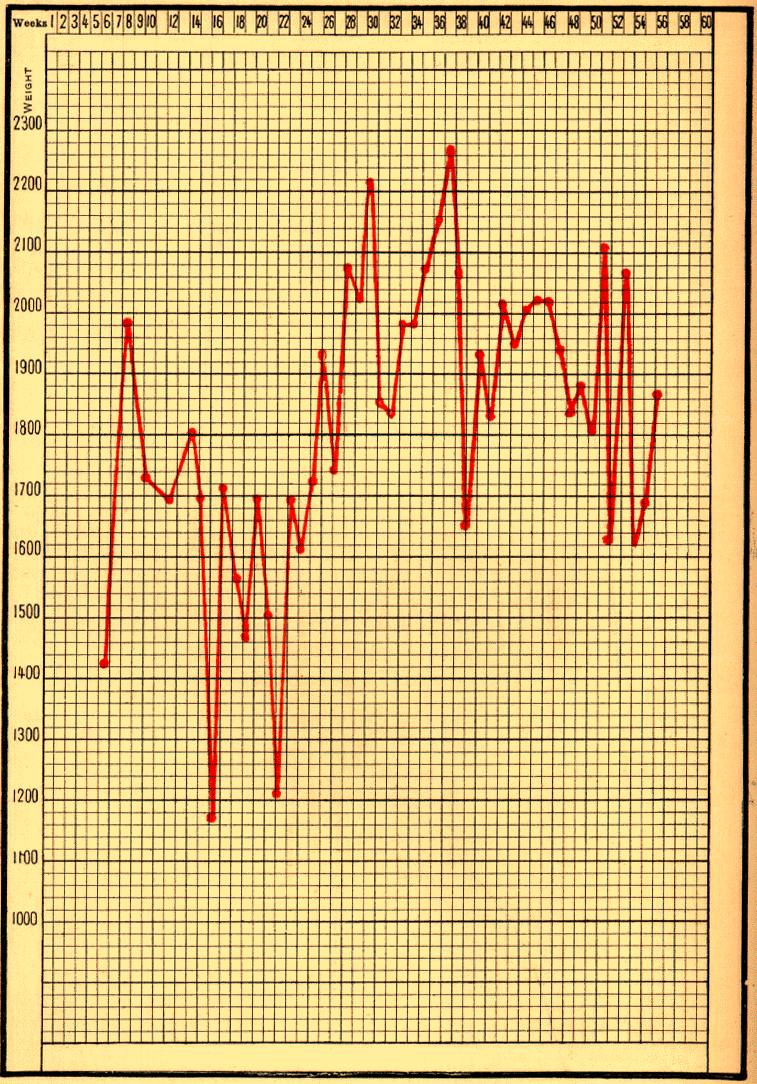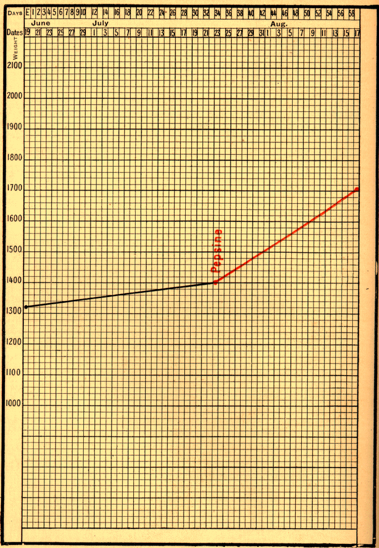 Fig. 32. Weakling whose weight was almost stationary. Pepsin was given and his curve rose. | |
