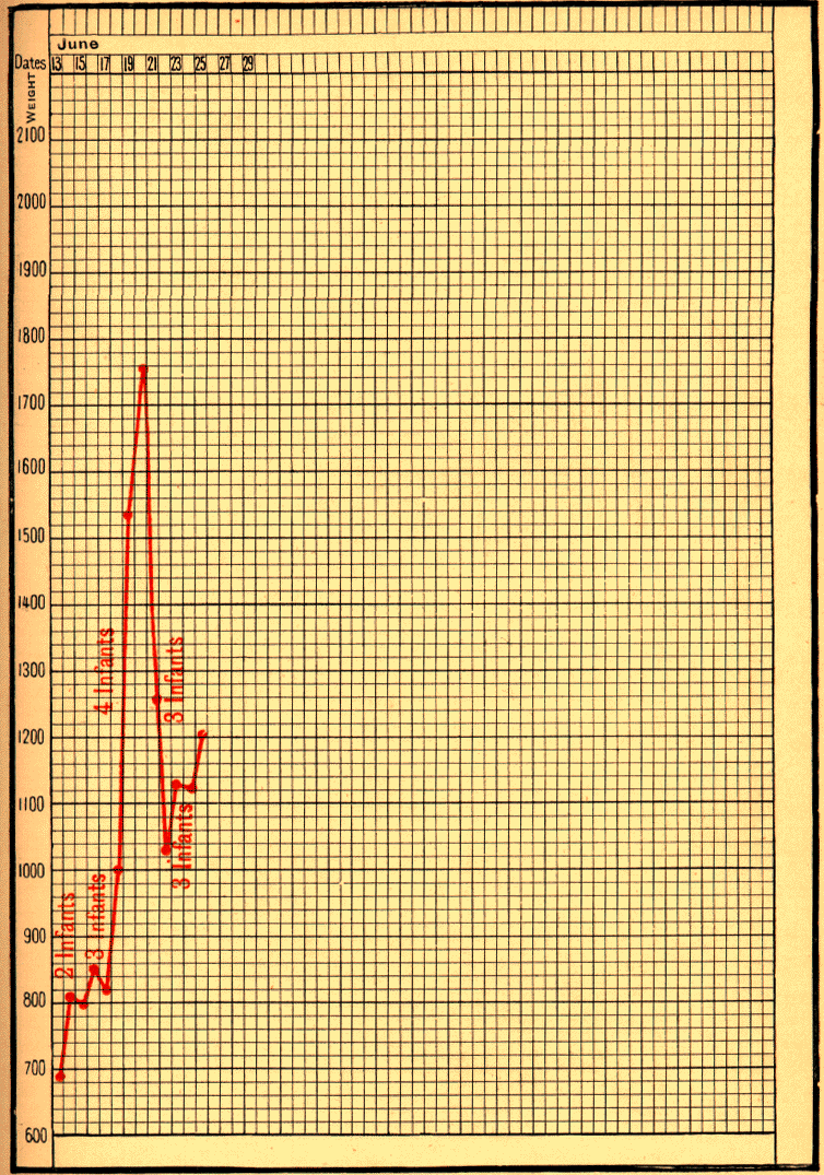 The children of the wet-nurses were well supervised; they were weighed every week, and curves of their weights were kept. These curves are very satisfactory -- at least equal and often superior to the normal. We had recourse in their case to mixed feeding. Several weeks after their entry, when we had made sure that they were digesting well and steadily increasing in weight, we gave them pure sterilised milk to the extent of at first 100 grams per day, and later, 200, 300, 400, 500, &c. The amount of milk which they obtained from their mother was correspondingly reduced to 400, 300, or 200 grams, and the rest of her supply was left for the benefit of the weaklings entrusted to her care.
