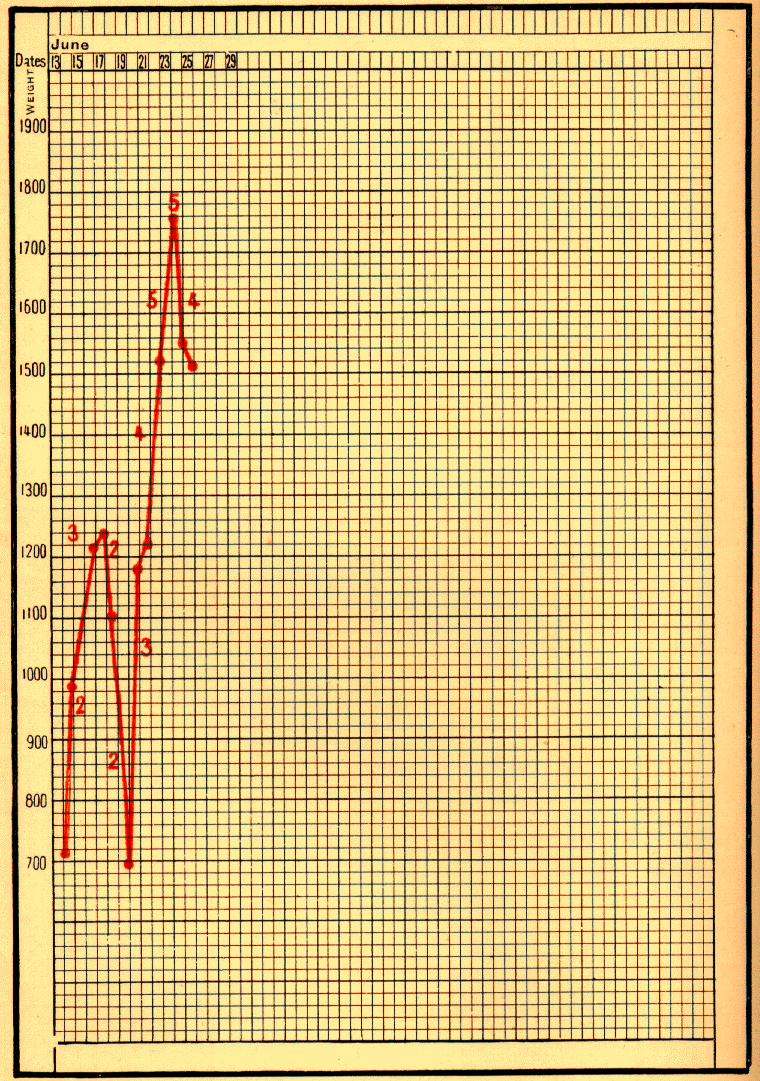 Here is another example. An infant, born on June 18, 1895, was brought next day to the hospital (No. 213). It weighed, on arrival, 1320 grams, and its rectal temperature was 35.4° C. It augmented very little, so that at the end of a month and three days it had gained but 75 grams. Pepsin was given, and under its influence the curve began to ascend (Fig. 33).