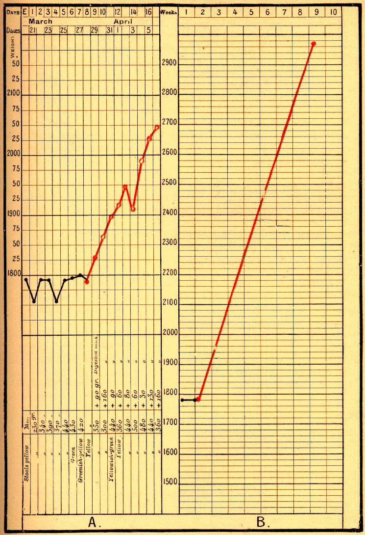 The infant G. D. (No. 72) was born at the Maternité on March 11, 1896, weighing 1900 grams. On March 20, when it was admitted to our wards, its weight was only 1780 grams. On March 28 it weighed 1790 grams, an increase of 10 grams, an average gain of 1.9 grams per day (Fig. 36A and B). As it was remaining practically stationary, it was given digested milk. Immediately it began to increase, and to such purpose that it weighed 2970 grams on May 29. It had added 1180 grams in 61 days, an average of 19.3 grams per day.