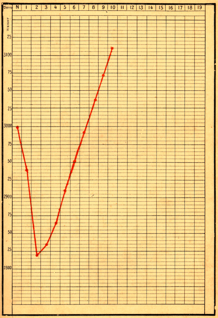In case of illness of either mother or child most minute attention must be paid to the latter. The woman, Sch____, was delivered of a daughter on February 21, 1888, who weighed 3090 grams (Fig. 53). On the sixth day she was 3070 grams, and had thus nearly regained her initial weight. As the mother was then attacked by mastitis, the infant steadily lost weight, till on the ninth day she was only 2990 grams. Asses' milk was given, and the curve rose once more.