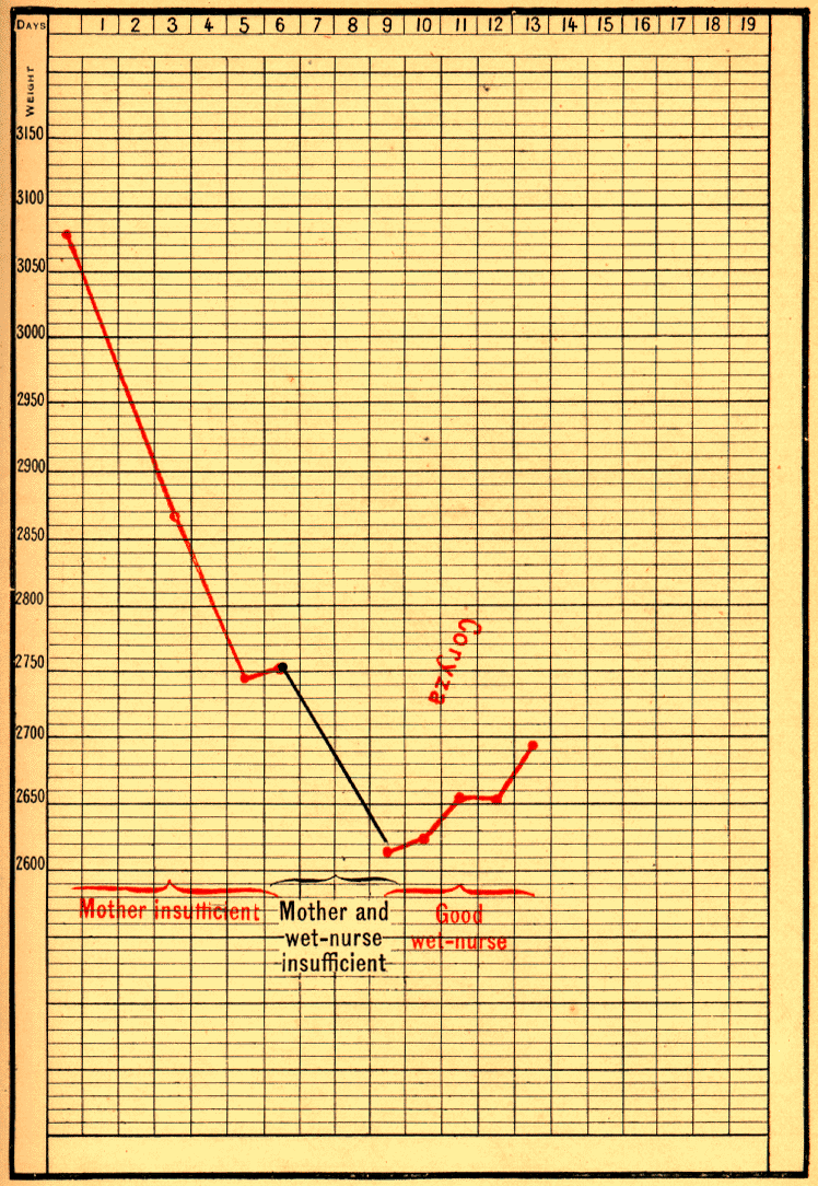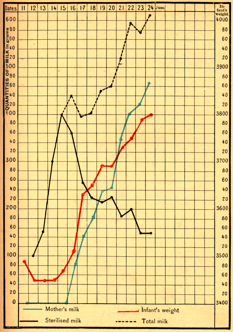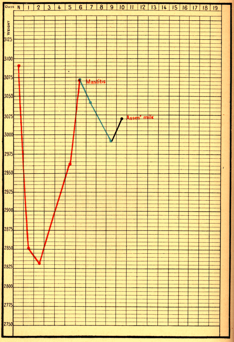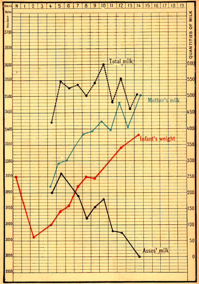 If, ignoring the details, we study the curve as a whole, we see that in proportion as the quantity of the maternal milk increases the asses' milk was diminished, till on the fourteenth day the former had attained 504 grams and the latter zero. During this time the infant's weight followed practically the normal curve; after an initial loss of 190 grams, which he regained on the ninth day, he reached 3380 grams on the fourteenth day, after which the mother alone sufficed for the feeding.