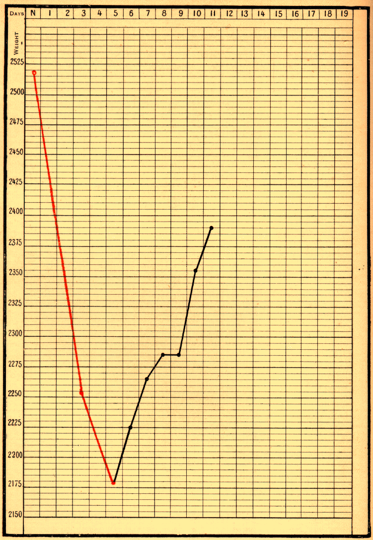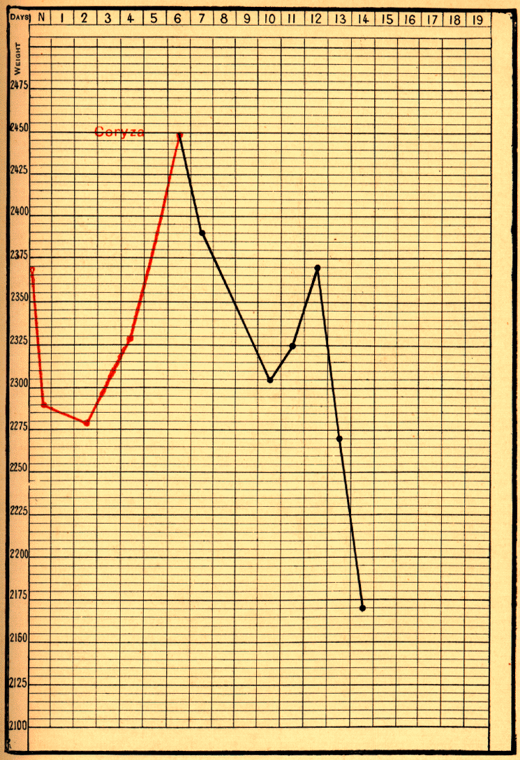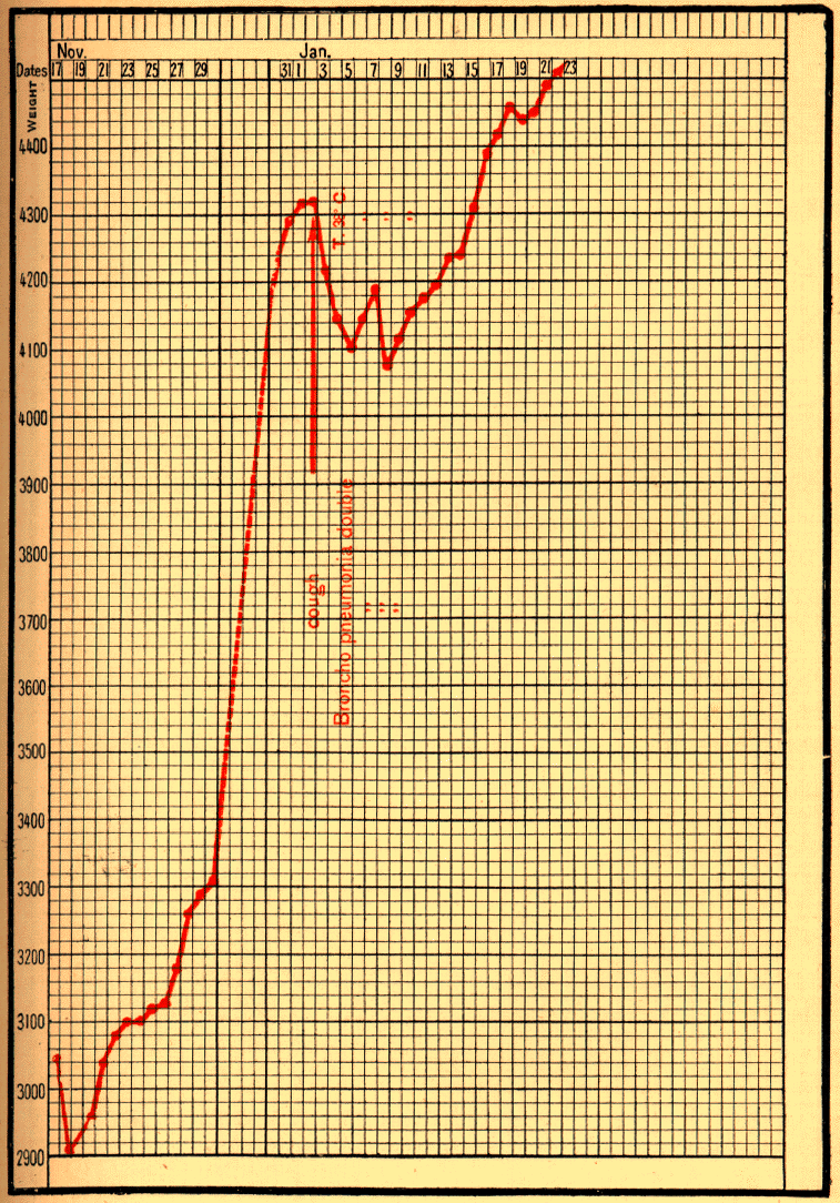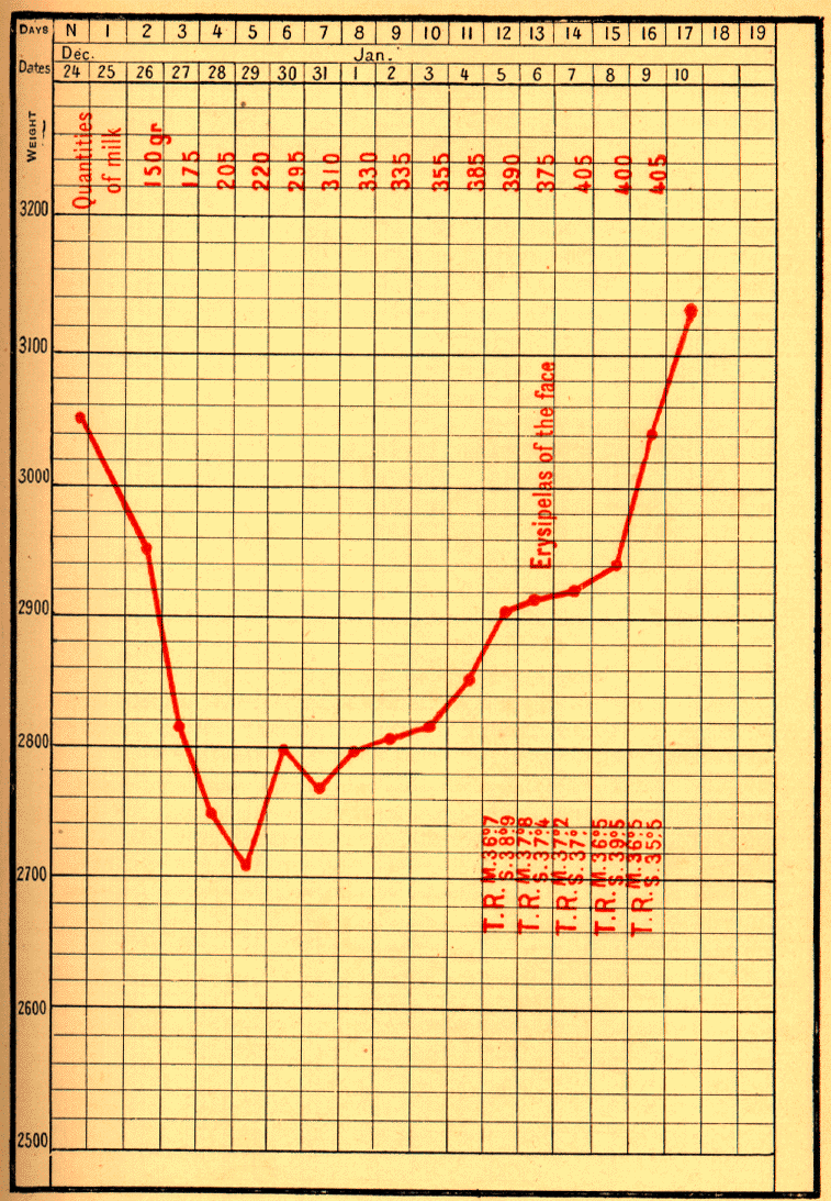 Baby El___ H____ (No. 366), born on November 4, 1895, was brought to the Maternité weighing 1990 grams and with a rectal temperature of only 32° C. He progressed slowly, and on November 30 he weighed only 2110 grams. On December 2 he took influenzal coryza and diminished slightly; on December 18 he weighed 1930 grams, when suddenly he began to increase remarkably.