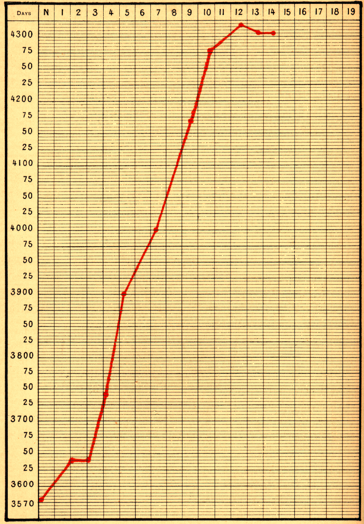 Still more conclusive was the case of the infant Go____, who had weighed 3550 grams at birth (Fig. 48). The second day it had lost 50 grams. Then it rapidly increased, and reached 3690 on the fifth day. On the seventh its weight was only 3630 grams; the diminution continued on the eighth, and it was then discovered that the mother, a woman of small intelligence, did not wish to rear the child. She was supervised, and on the ninth day the infant increased 20 grams; as on the tenth it diminished again, I demanded an explanation from the nurse in charge of the case. She confessed she had been too busy to keep proper watch, but promised to do so faithfully in future. On the eleventh day the infant weighed 3610 grams, on the twelfth 3650, and, the supervision being again neglected, on the thirteenth day the weight remained stationary. As I stimulated anew the zeal of the staff, its weight rose to 3690 grams by the fourteenth day, 3750 by the fifteenth, and 3810 by the sixteenth, an increase of 160 grams in three days.