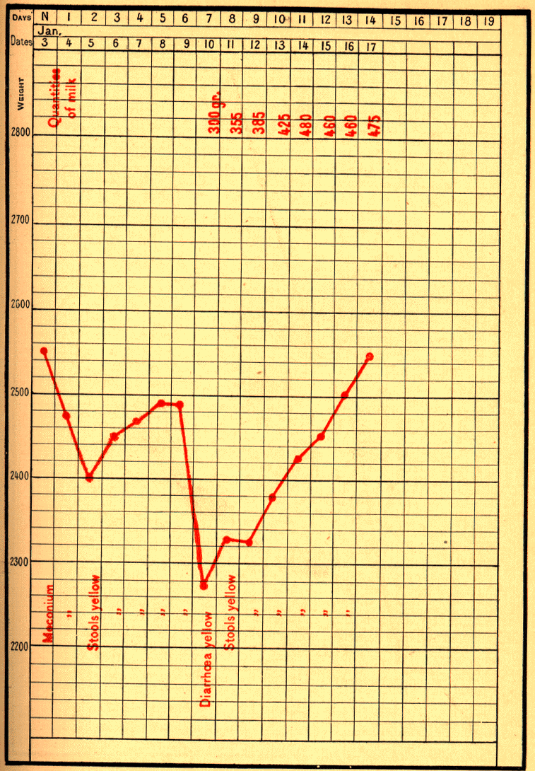 Not merely in these exceptional and somewhat deceptive cases, a knowledge of which is essential to avoid mistakes, is the great importance of the balance as a guide to the progress of the child indisputable. It is often said that simple inspection enables a practised eye to appreciate whether an infant is or is not thriving. Don't believe it. Obviously, the general aspect, the firmness of the tissues, the state of the sutures and fontanelles may furnish certain indications, but if you are dealing with several infants at the same time mistakes are easily made. How often at the beginning of my hospital career was I assured that an infant who seemed to me to be suffering was doing well, on having it weighed before me did I find that it had lost 400-500 grams and was already almost beyond remedial measures. But when at the bed of each mother the chart of the infant's weight is found, a simple glance informs you of its progress, and warns you to seek an explanation, on the slightest departure from the normal.