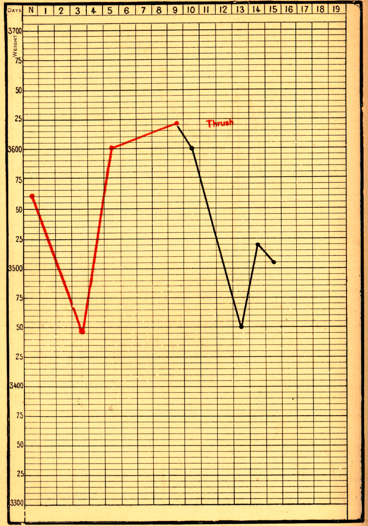 Thrush also causes much loss of weight, perhaps because sucking gives the infant pain. Baby Bron____, born on February 15, 1888, weighed 3560 grams (Fig. 55). On the ninth day it took thrush, and lost 170 grams in four days. Once cured and able to suck freely again, it soon regained what it had lost. In these cases, where the infant ceases to take sufficient nourishment at the breast, you must feed it by glass or spoon, or even by gavage.