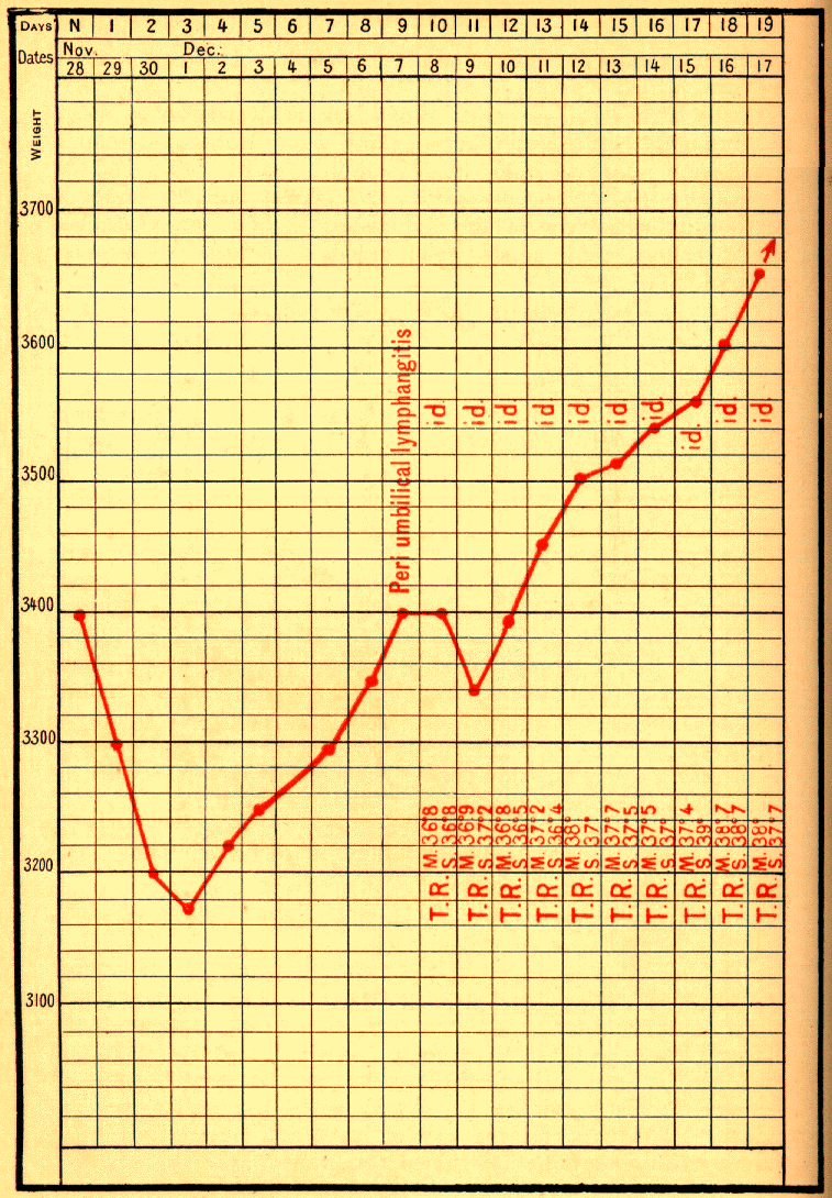 Baby Réné X_____ (No. 1612), born on November 28, 1898, weighed 3400 grams. On the ninth day, December 7, having just regained his initial weight, he developed a lymphangitis in the neighbourhood of the umbilicus. His temperature rose to 38° C. on the 12th, and 39° C. on the 15th; extensive ulceration took place, and yet his weight was not greatly affected. On December 8 he remained stationary; on the 9th there was a loss of 60 grams; but thenceforth, increasing daily, he attained on the 17th, 3655 grams. There was thus an increase of 315 grams in eight days, and an average gain per day of 39 grams (Fig. 57).